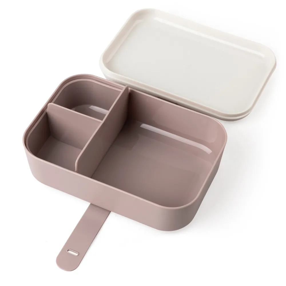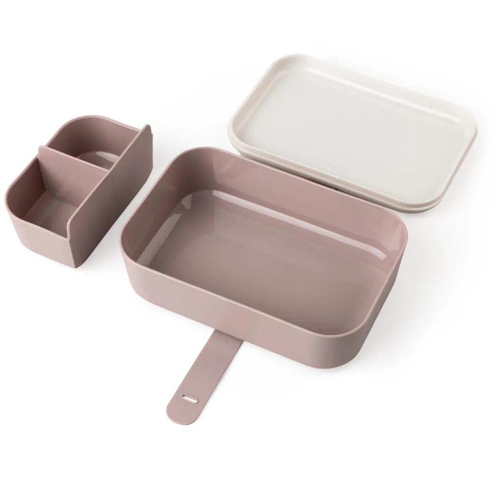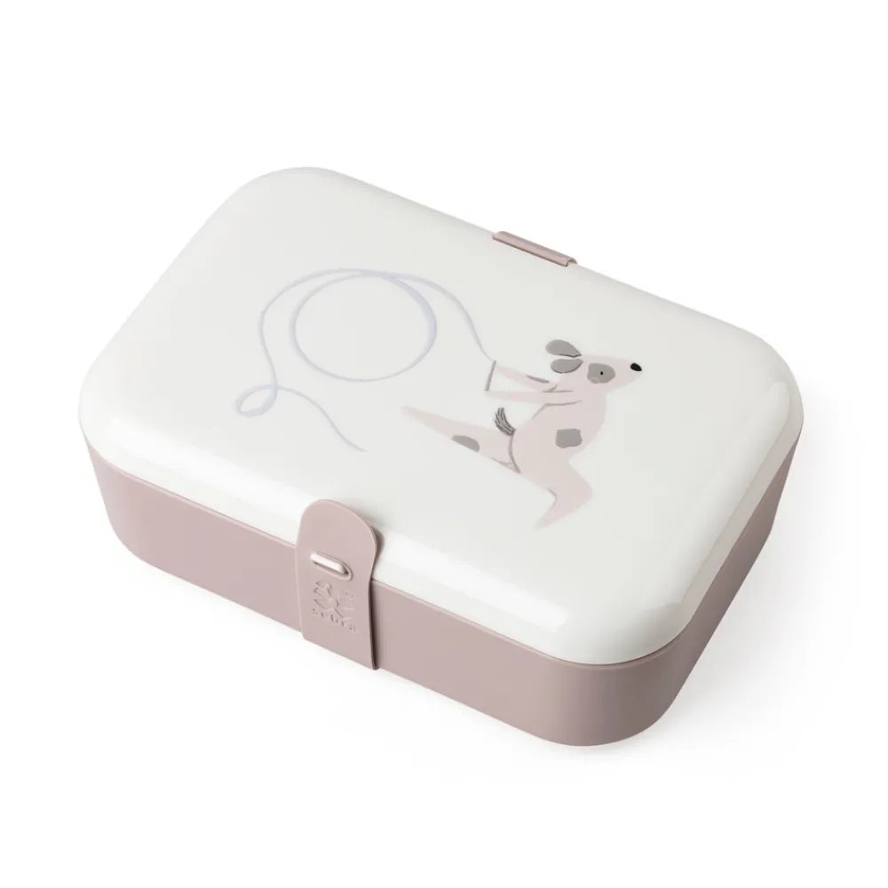 Låget på madkassen holdes på plads af en slidstærk silikonerem, der er nem for små hænder at tage af og sætte på igen. Madkassen kommer med en løs beholder med 2 rum, der fungerer som en rumdeler, hvilket gør det lettere at holde forskellige typer mad adskilt og dermed mere friskt og indbydende. De 2 rum er ideelle til nødder, grønsager eller andre snacks. Dette gør madkassen ekstra velegnet til at medbringe måltider til vuggestuen, børnehaven, skolen eller endda til en picnicudflugt. Madkassens bund er helfarvet i en støvet rosa-lilla farve mens låget på toppen har et flot print med en Teeny Toes, der nyder at lave danseserier hvor hun svinger med sin vimpel.