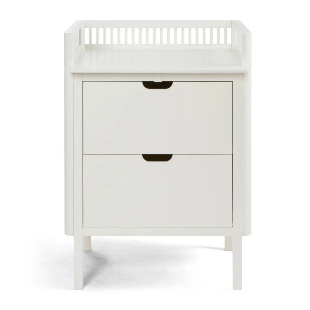 Sebra Puslebordet er et elegant, funktionelt og dansk-designet 2-i-1 møbel, som kommer med en kommode, en pusleplade og henholdsvis to skuffer. Puslebordet er designet med et skandinavisk og tidløst udtryk, der harmonerer med de øvrige møbler fra Sebra’s klassiske møbelkollektion. Et funktionelt, sikkert og klassisk puslebord uden uønsket kemi og med lang levetid til børneværelset, soveværelset, badeværelse eller et andet sted i hjemmet. Her ses Sebra Puslebordet med skuffer og i farven Classic White. Sebra Puslebordet med skuffer er et puslebord, der let kan forvandles til et klassisk opbevaringsmøbel, når behovet for puslebordet hører op. Puslepladen er lukket bagtil og til siderne og fremstår med en forhøjet kant med små runde tremmer, som er med til at give puslebordet det karakteristiske udtryk, som Sebra Sengen er så kendt og elsket for. Puslepladen (indvendige mål) har en dybde på 66 cm og en bredde på 69 cm, hvilket giver plads til en puslehynde og andre puslefornødenheder, som kræves i forbindelse med et bleskift, tøjskift eller blot en hyggestund med babypludder. De to skuffer giver mulighed for opbevaring at tøj, bleer, legetøj eller hvad der nu måtte være behov for. Skufferne er udstyret med ”softluk”, som sikrer, at skufferne lukkes stille og roligt. Derved minimeres risikoen for at få fingrene i klemme, og det er en god ting på netop børneværelset, hvor små fingre ikke altid er så hurtige, som de store. Den praktiske forvandling fra puslebord til opbevaringsmøbel sker ved, at puslepladen nemt fjernes fra underdelen. Denne egenskab gør, at det ikke er nødvendigt at opmagasinere et komplet puslebord eller skille sig af med puslebordet i perioden imellem blebørn – eller når behovet for et puslebord blot forsvinder helt. Det giver puslebordet en ekstra lang levetid og et produkt, der kan vokse med barnet eller dets søskende – et møbel, der let kan gå i arv. Fronterne fremstår med udskårne greb, der sammen med kommodens afrundede hjørner er med til at øge sikkerheden på børneværelset – ingen skarpe kanter, som kan give ridser og skrammer. Puslebordet er på fire ben, hvilket sikrer et lettere og mindre bastant udtryk end et puslebord uden ben. Det giver naturligvis også mulighed for opbevaring under kommoden, hvis behovet er der.