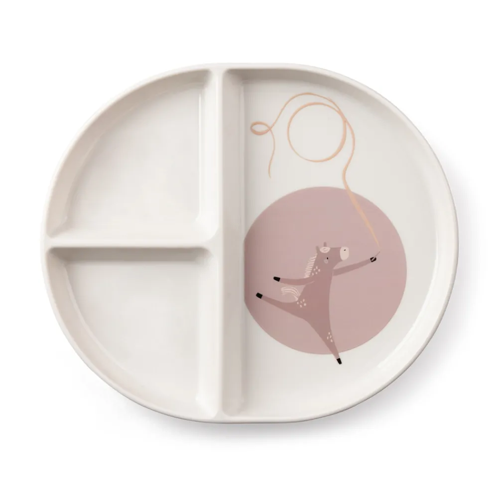 Flot ruminddelt tallerken med tre rum, der har motiver fra Sebras tema Teeny Toes – en fortælling om glæden ved at bruge kroppen og udtrykke sig gennem hop, dans og leg uanset forudsætninger.