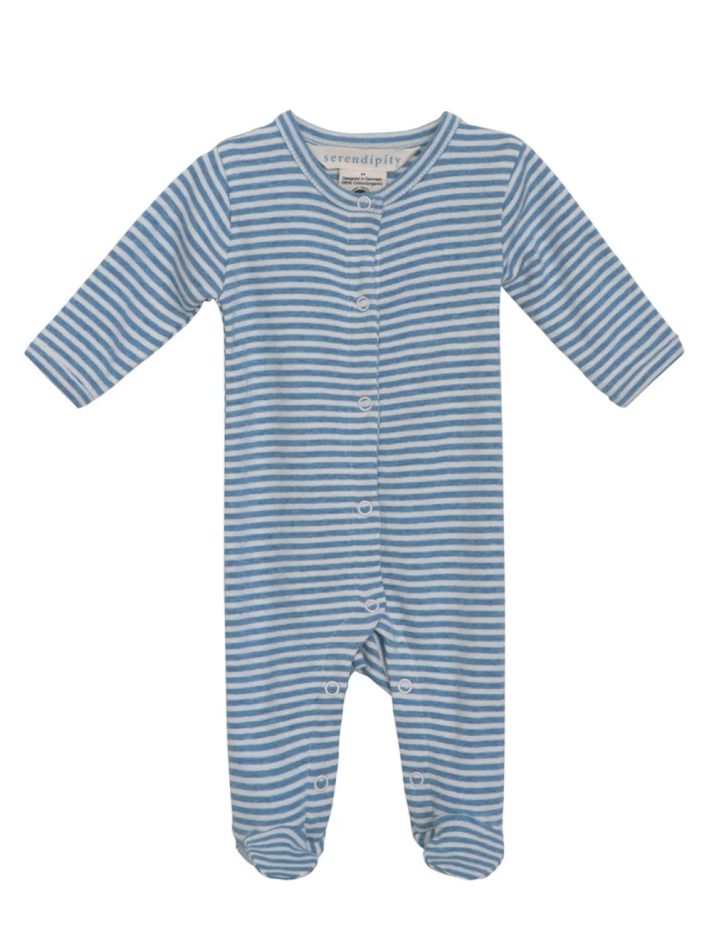 Heldragt til nyfødte i blød rib i striber. Fuld åbning foran og i ben så af- og påklædning er let. Åbnes med trykknapper. 100% blød økologisk bomuld.