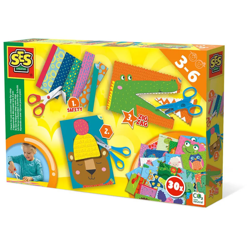 Lær at klippe på en sikker måde. Med disse farverige kort og tilhørende sakse med flere sværhedsgrader kan du blive god til det. Start med en sikkerhedssaks, som kun kan klippe i papir. Kan hverken klippe i fingre, hår eller tøj. Når barnet er parat, kan der avanceres til en rigtig saks. Der er 30 kort, som har forskellige klippeopgaver. Sidst men ikke mindst, kan saksen med zig-zag mønster, lave flotte mønstre, som f.eks. krokodilletænder.