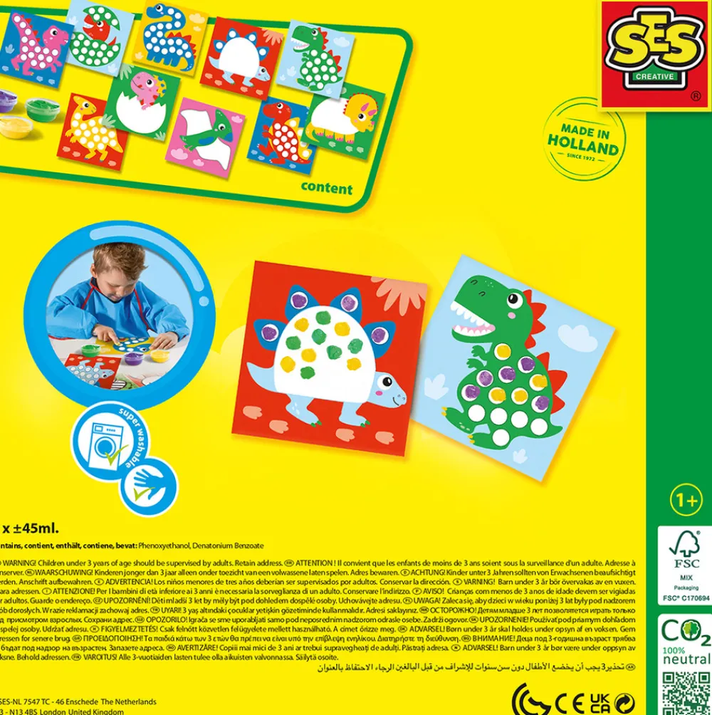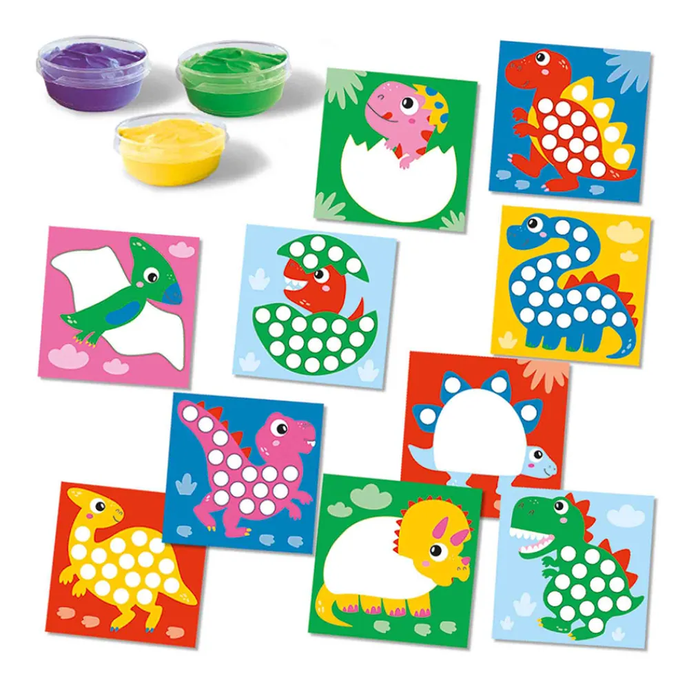 Sættet indeholder 10 dino-kort og 3 farver fingermaling. Børn kan dekorere de forskellige dinosaurer, lige som de vil, ved at bruge fingrene til at male med.