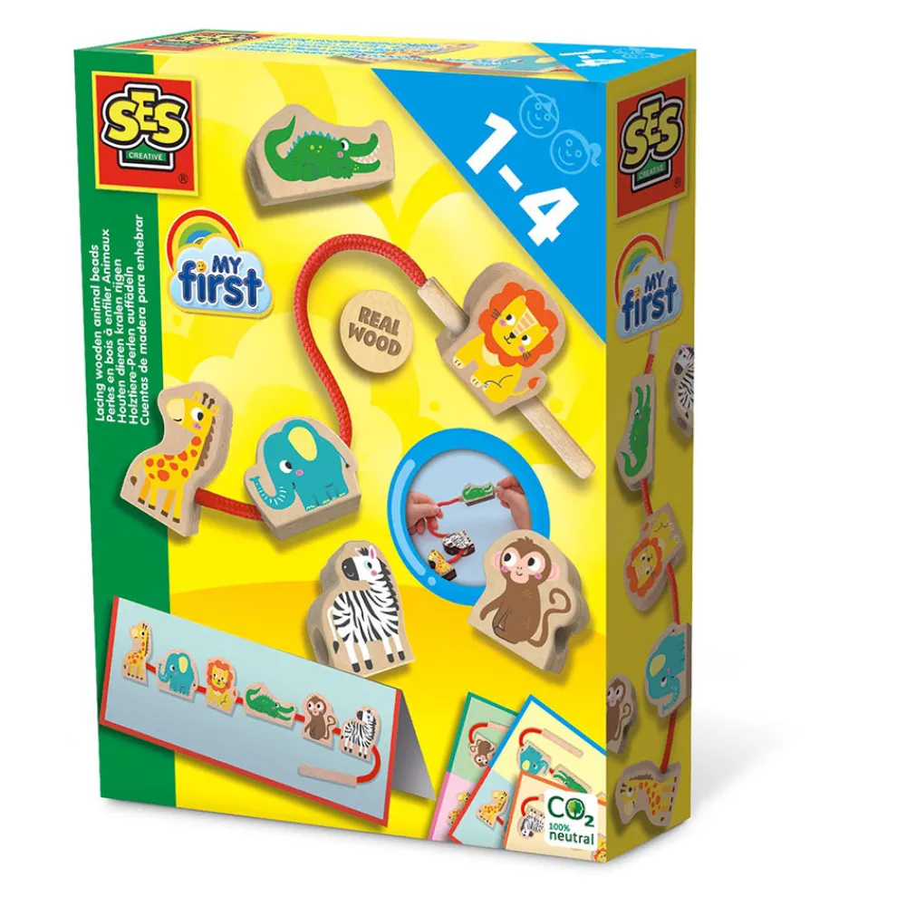 Styrk dine finmotoriske evner, ved at tråde figurer i træ. De 6 træfigurer forestiller forskellige jungledyr.