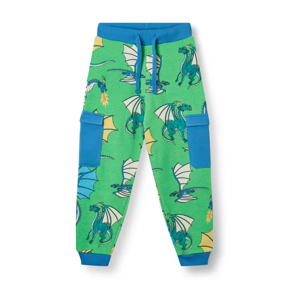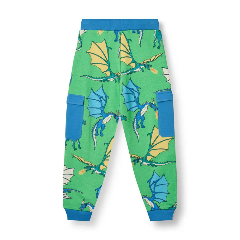 Bukser i et ubørstet sweat materiale med flyvende drager, produceret i 100% økologisk bomuld. Bukserne har en afslappet pasform med almindelige buede lommer foroven og cargo-stilet lomme med flap på begge sider af benene. Bukserne har ribkant i taljen med elastik og snore til justering, samt ribkant i manchetter.