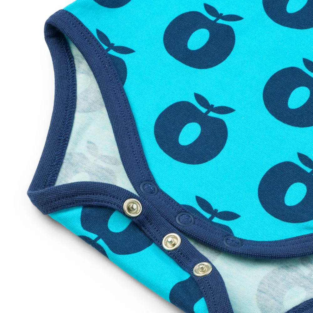 Langærmet baby body med æbler produceret i en økologisk og strækbar bomuldsjersey. Denne body er OEKO-TEX Standard 100® certificeret, hvilket betyder at denne body er produceret og testet for skadelige stoffer, så du kan passe på dit barns hud og helbred.Denne body har en normal pasform med kuvertlukning og trykknapper, samt ribkant i hals og ærmer. Småfolks body’er er designet i Danmark med tanke på at kunne holde til utallige eventyrer og leg, og bevare form og farver selv efter gentagen brug.