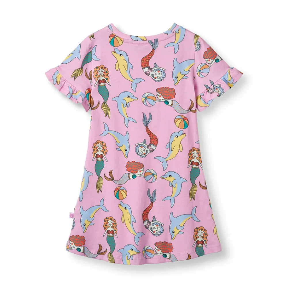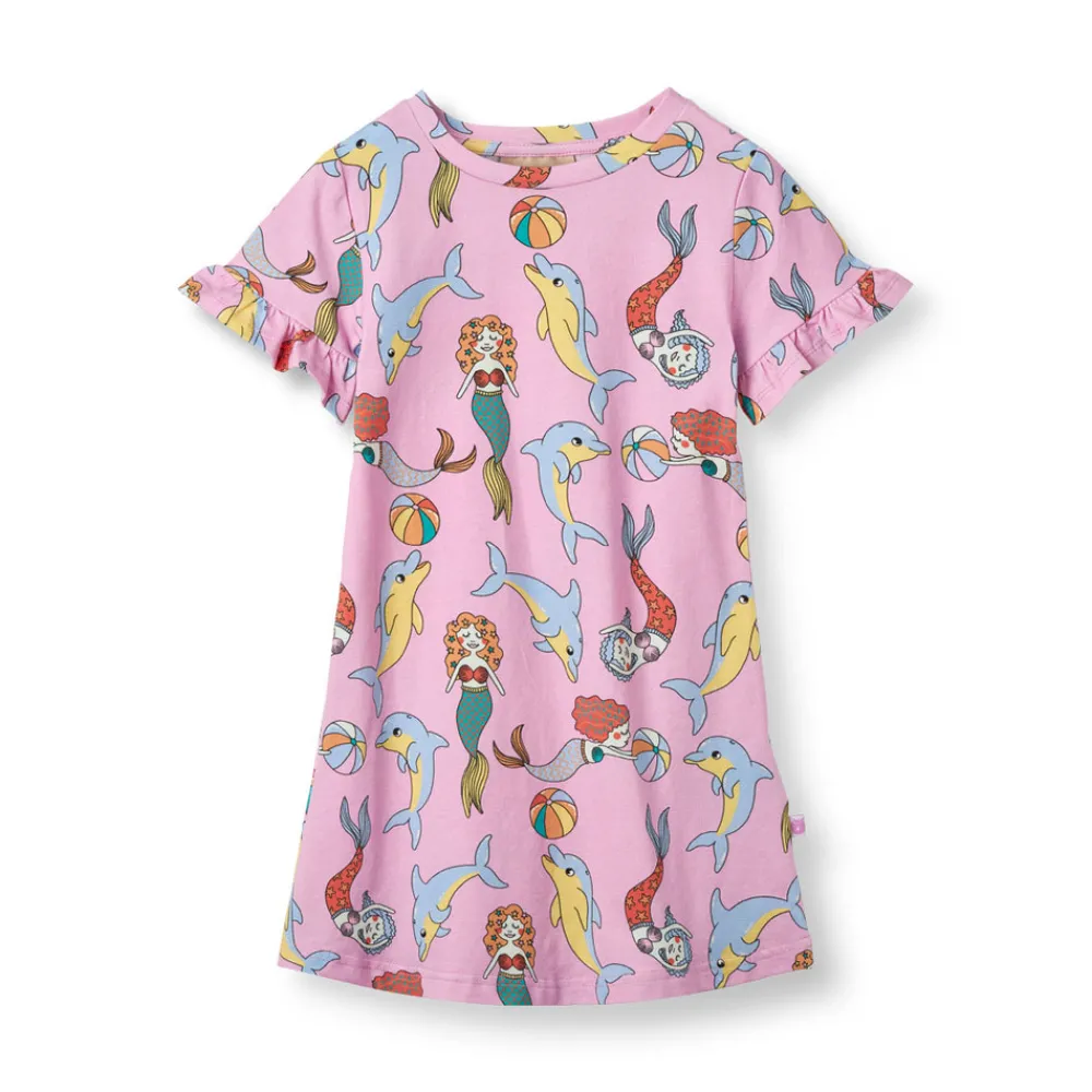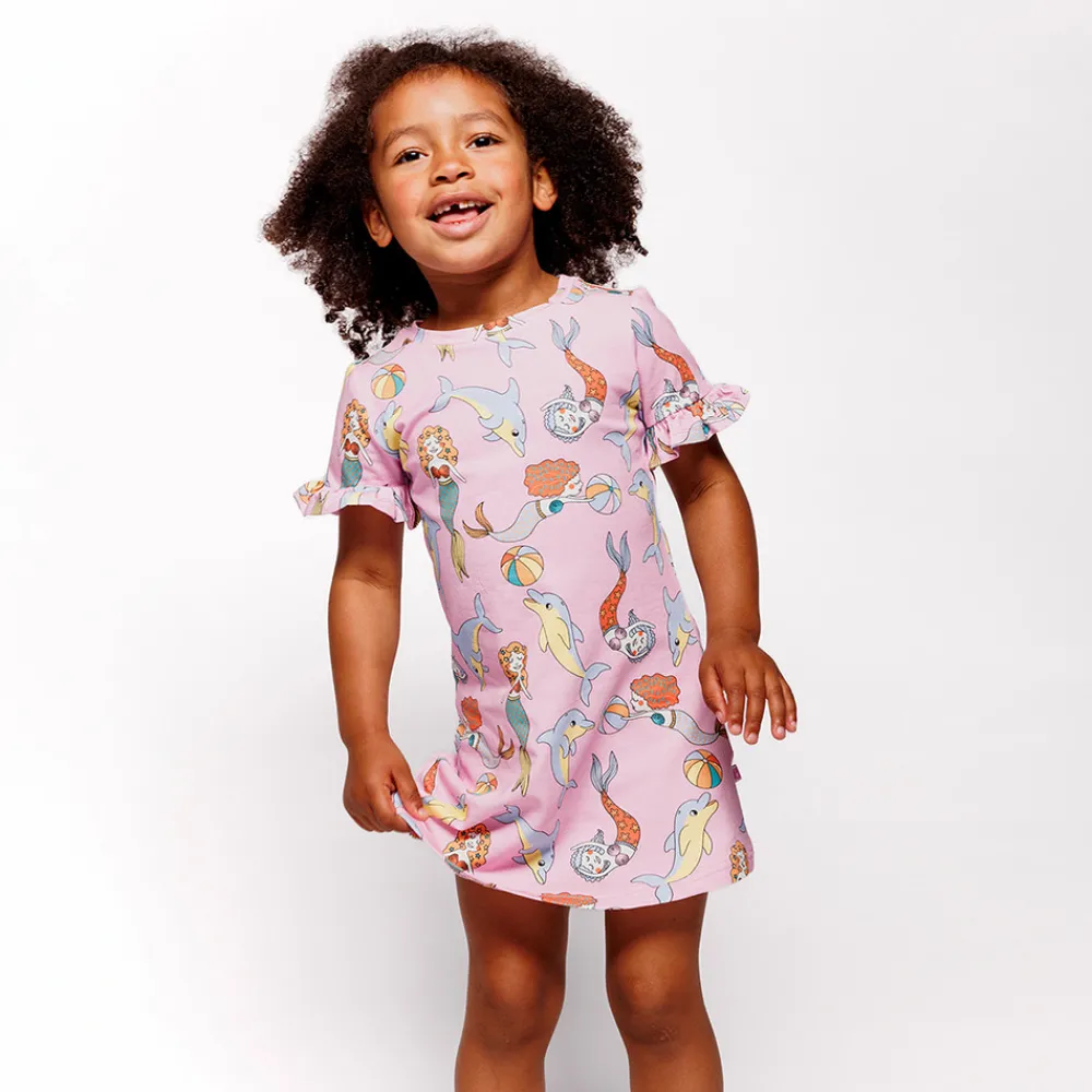 Deltag i det sjove med vores fortryllende print af havfruer og delfiner, der leger sammen i et hav af fantasi! Småfolks print er skabt med glade farver, detaljer og historier i tankerne. Denne kjole tilføjer personlighed til dit barns garderobe og sikrer komfort hele dagen.