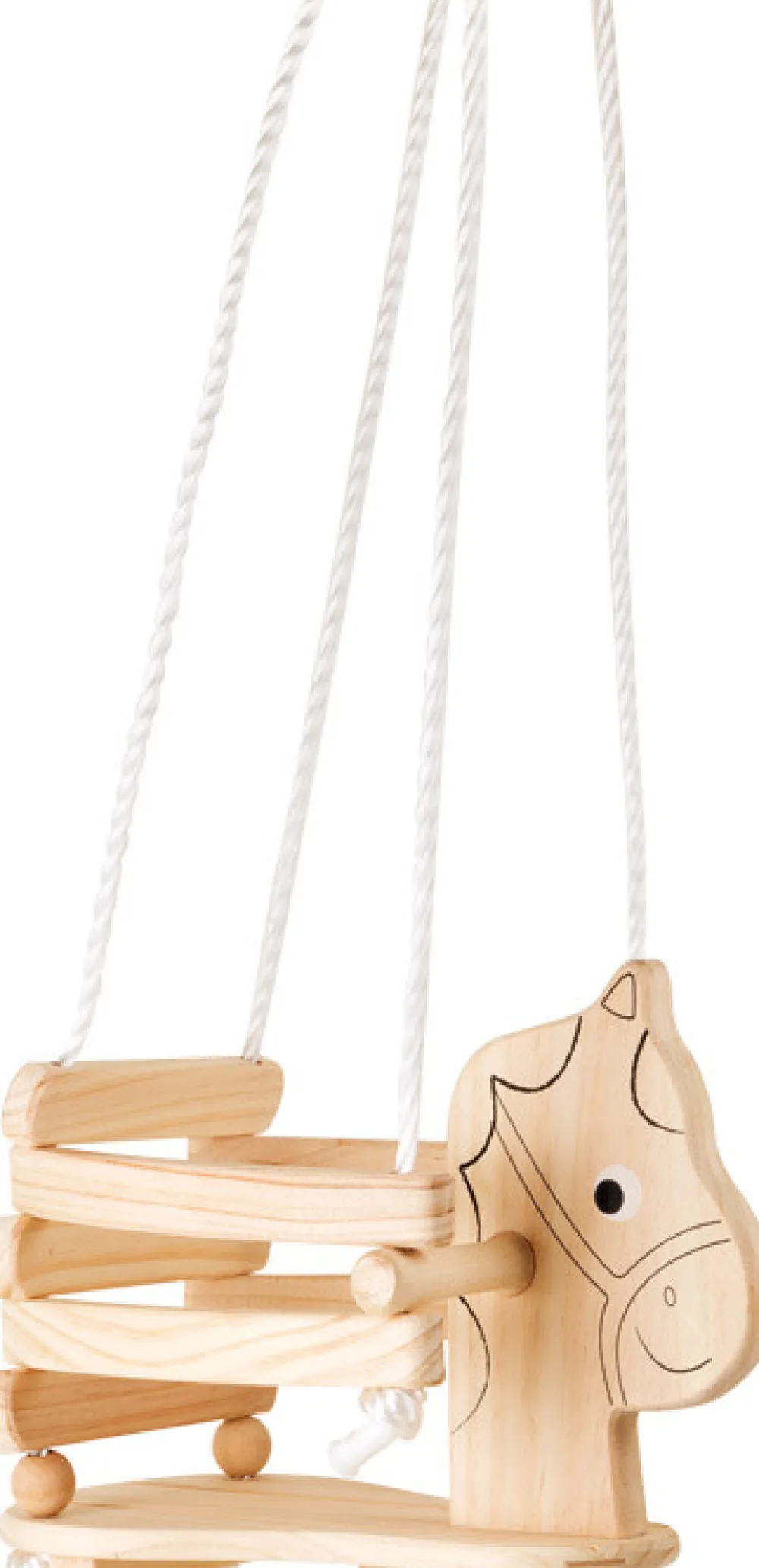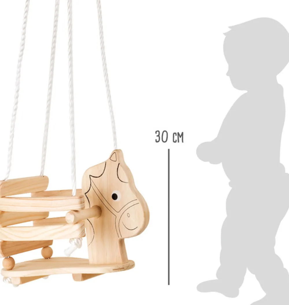 Denne solide træhest giver børn masser af sjov, mens de udvikler deres kropsbevidsthed. Gyngen er en fantastisk måde at bevæge sig på og have det sjovt. Den er særligt velegnet til små børn, da den høje ramme og håndtag giver ekstra støtte. Gyngen kan hænges op med de stærke reb og metalringe, både indendørs og udendørs.
