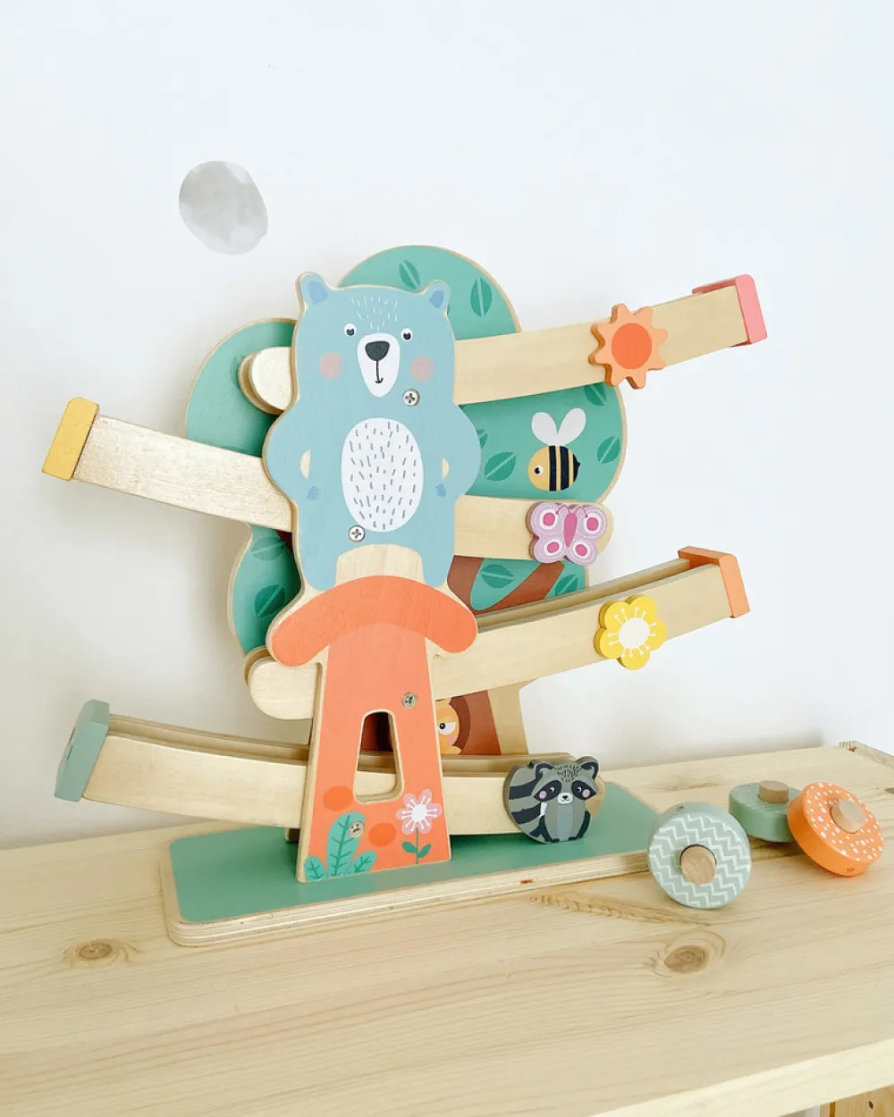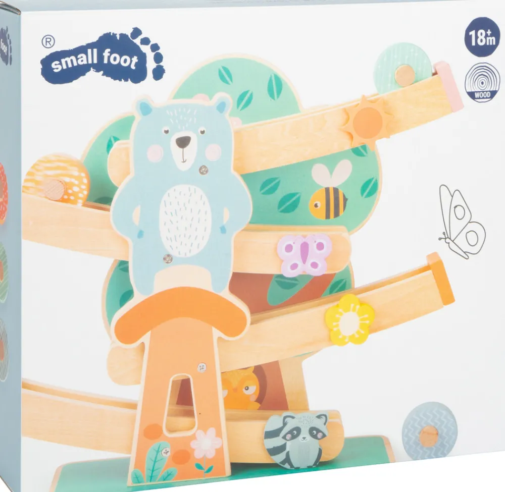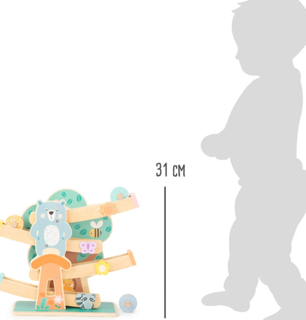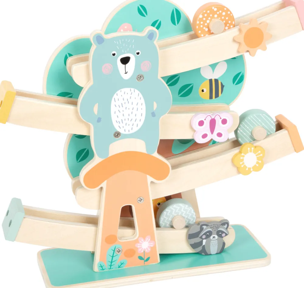 Er det tid til en hurtig tur gennem skoven? På denne robuste marmorbane i trendy pastelfarver kører tre farvede træhjul dekoreret med moderne mønstre ned ad en bane dekoreret med beboere i skoven. Langvarig legetid er forprogrammeret her! Et rigtigt blikfang og et attraktionspunkt for enhver børnehave! Særligt robust med den brede base!