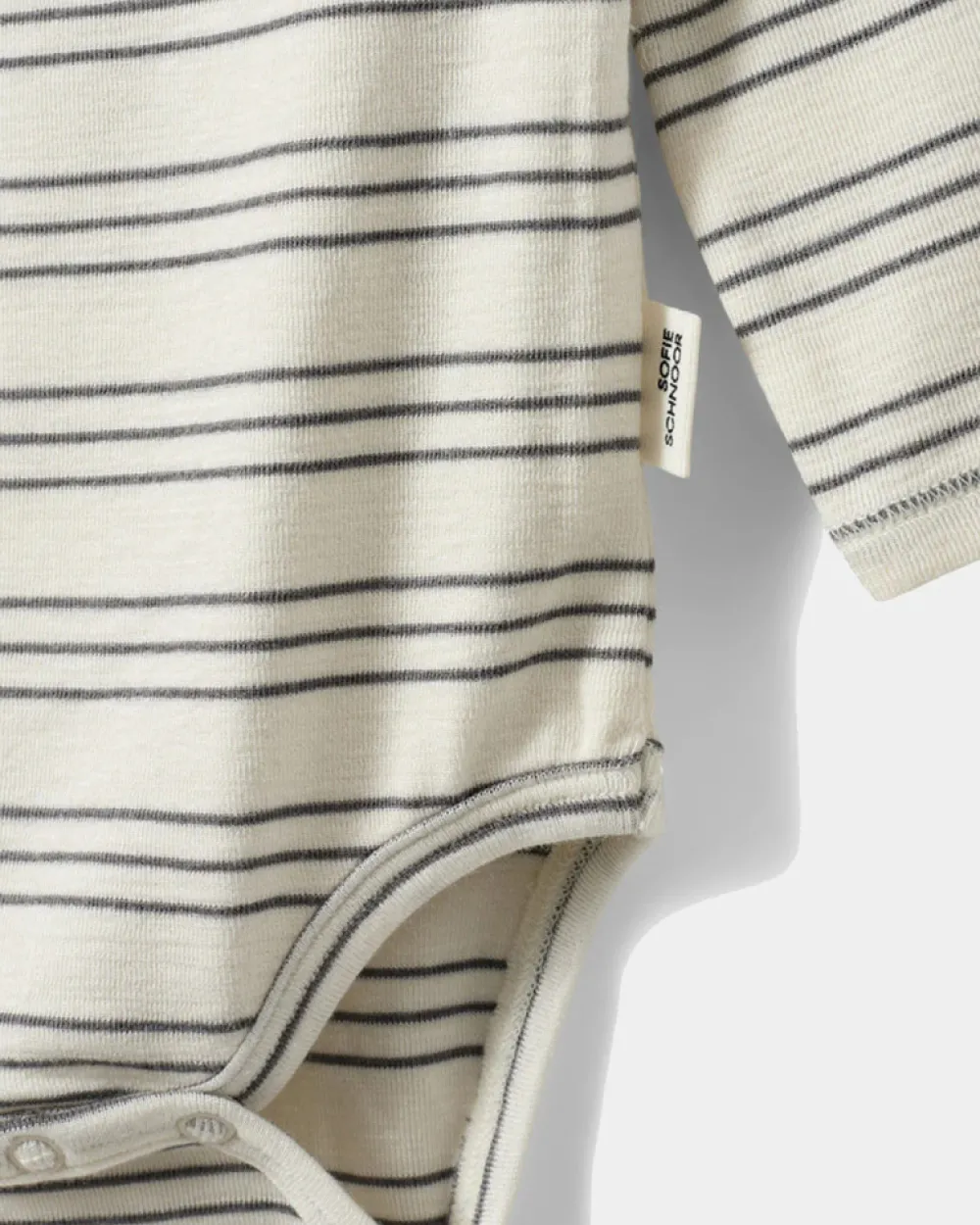 Miro Body fra Sofie Schnoor Kids er en skøn og komfortabel body til de mindste, udført i en blød bomuldskvalitet, der føles dejlig mod huden. Den klassiske antique white farve kombineret med fine, diskrete striber giver et tidløst og stilrent udtryk, som passer til enhver garderobe. Bodyen har en praktisk slå-om lukning med trykknapper, der gør det nemt at klæde baby på og af, uden at skulle trække tøjet over hovedet. De lange ærmer sørger for, at barnet holdes varmt, og den gode pasform sikrer bevægelsesfrihed hele dagen. Perfekt til både hverdag og hyggestunder.