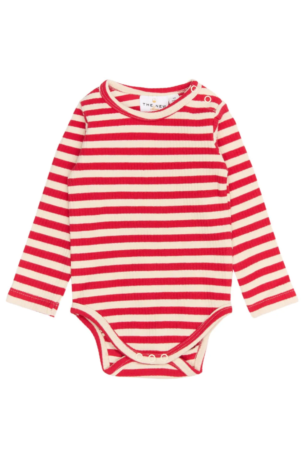 Denne langærmede body fra THE NEW Siblings er en blød og praktisk garderobe, der er vigtig for de små. Den har et klassisk stribet design og en slim pasform, hvilket gør den behagelig at have på under andet tøj. Kroppen lukkes med trykknapper ved skulder og bund, hvilket gør det nemt at tage på og skifte. Perfekt til både hverdagsbrug og leg.