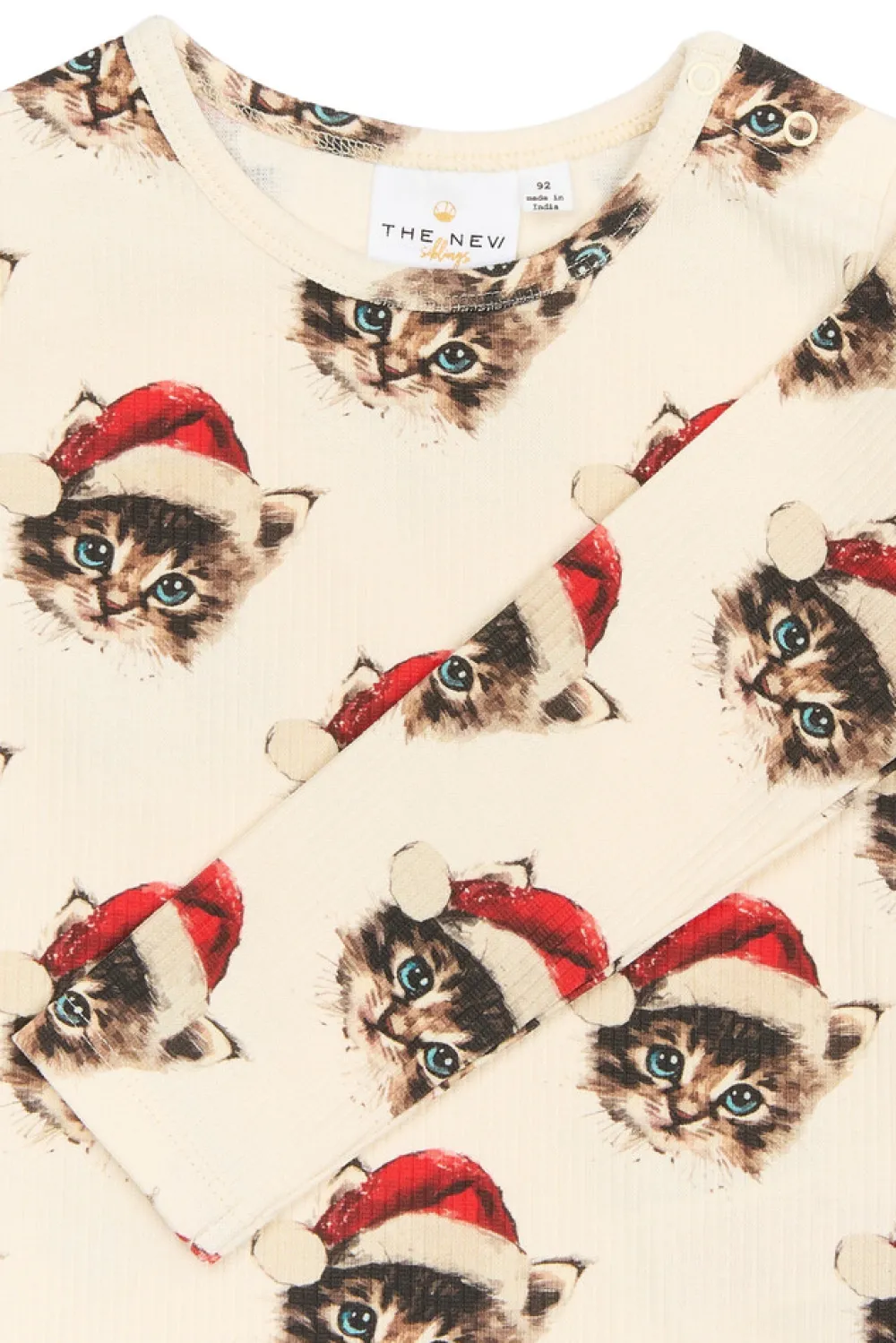 Dette pyjamassæt fra THE NEW Siblings er både hyggeligt og festligt – perfekt til sengetid i feriesæsonen. Det inkluderer en langærmet top og matchende bukser med et sjovt all-over print, der fås i to versioner: katte iført nissehuer eller dinosaurer i juletøj. Det bløde og strækbare ribbede stof sikrer god komfort og lang bevægelsesfrihed hele natten.