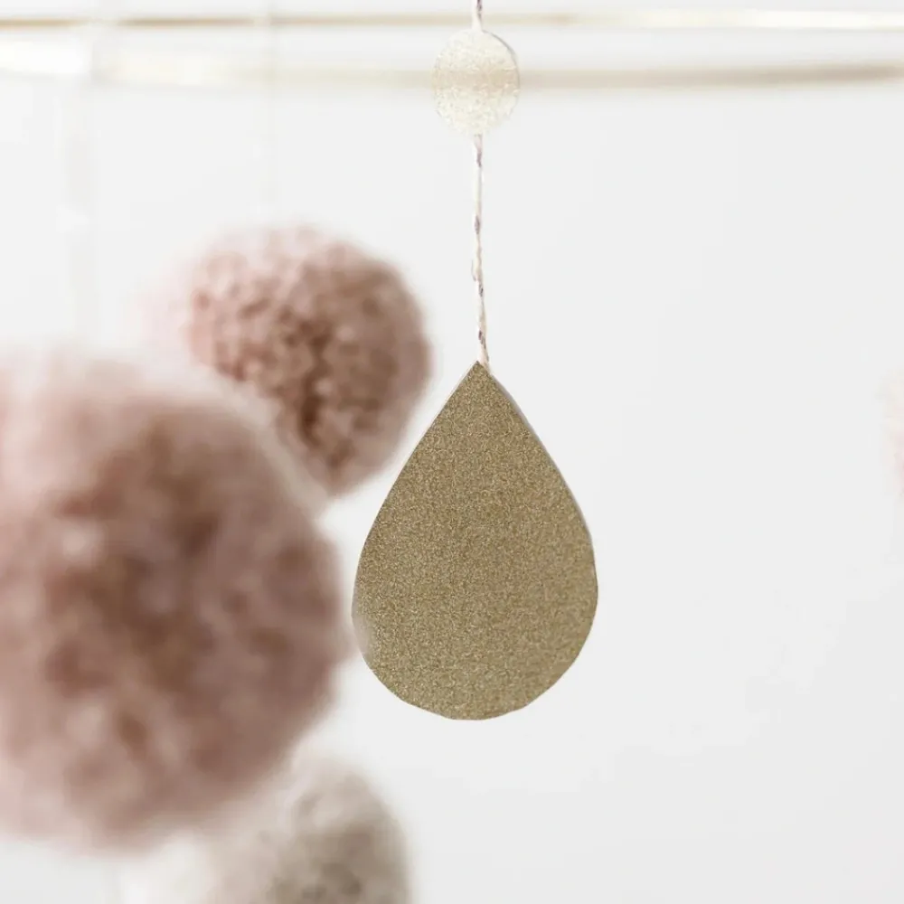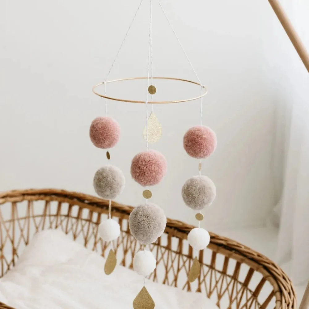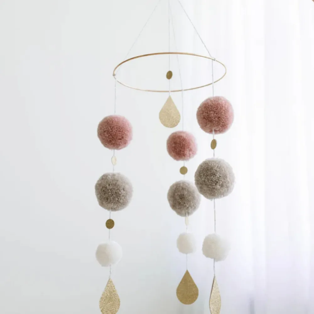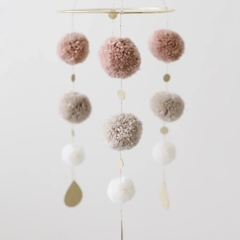Smuk kombination af håndlavede uld pom poms og skinnende detaljer engagerer din babys fascination af form og farve. Neutrale og pastelltoner giver en delikat indretning til babyens værelse