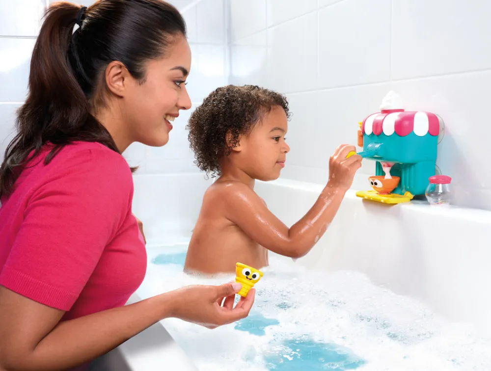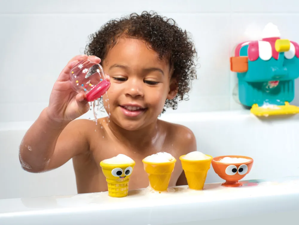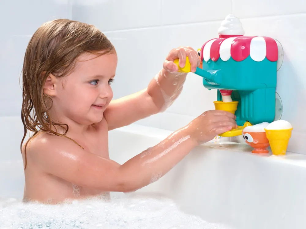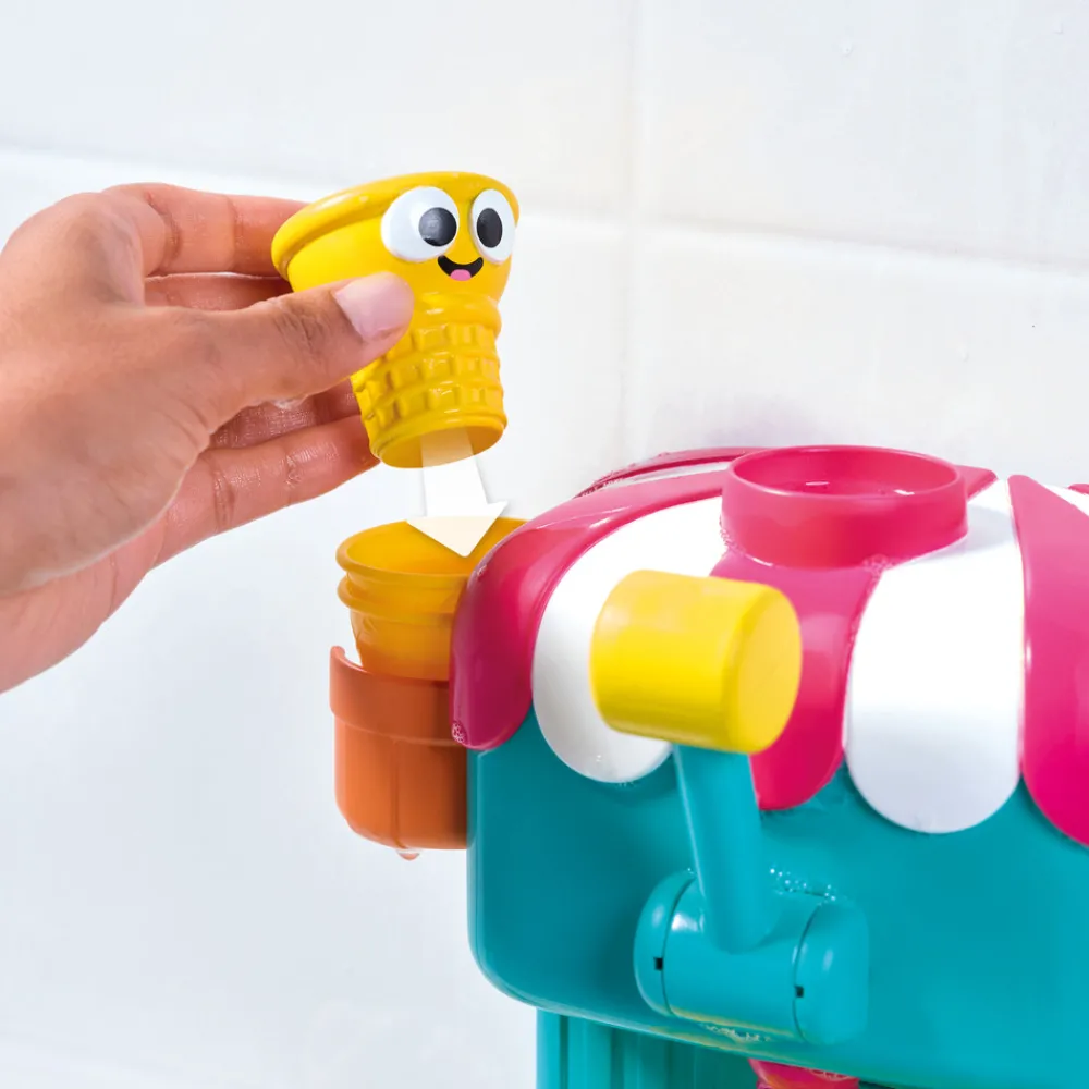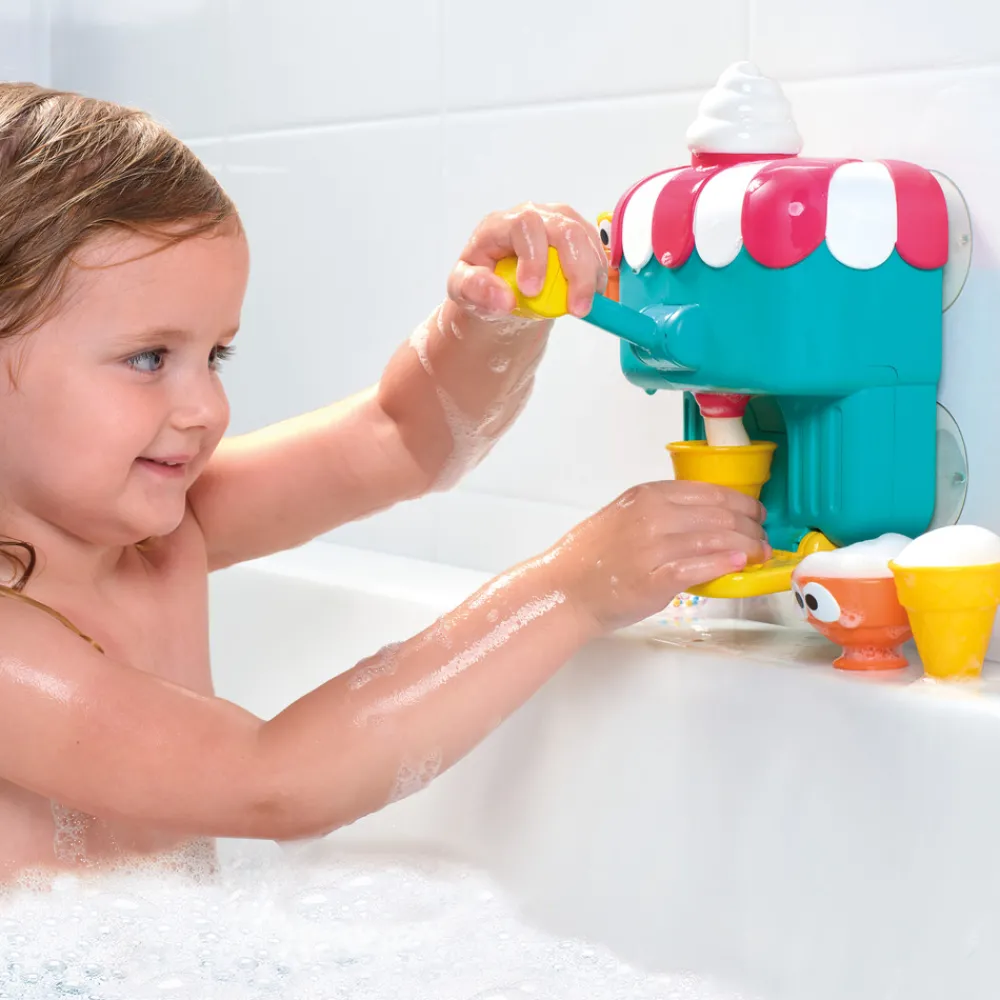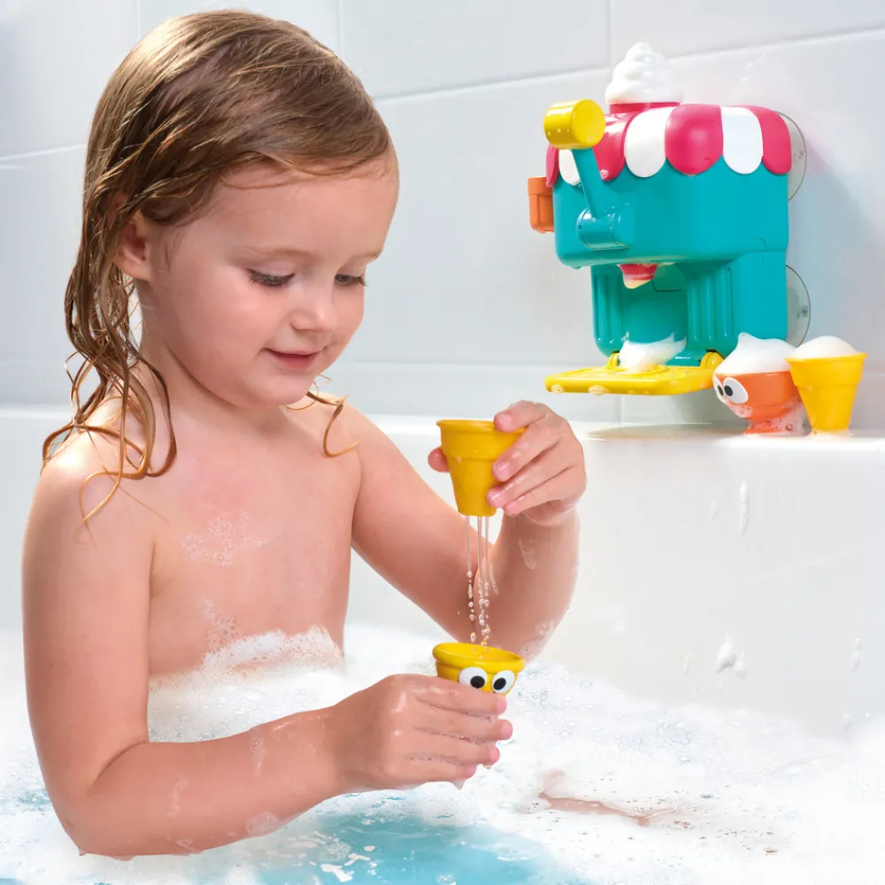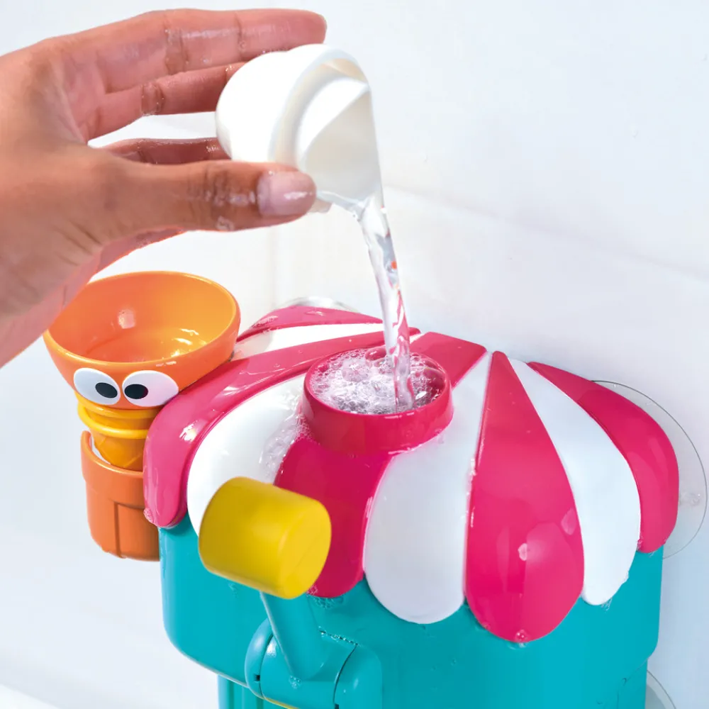 Gør badetid ekstra sjov med Toomies Isbutik Deluxe! Fastgør den til din badeværelsesvæg med sugekopperne. Børn vil elske at lege, at de laver deres egen is! Du skal blot tilføje en lille mængde boblebadsæbe og vand i den øverste vaffel og trække i håndtaget. Børn kan endda lægge sidste hånd på værket ved at lege, at de putter drys på! De vil elske at se med deres egne øjne, hvordan “isen” fluffer op og bobler i vaflen! De tre fladbundede vafler er designet til at stå stabilt på siderne af badekarret, klar til drys fra shakeren, der følger med sættet. Toomies Isbutik Deluxe er ideel til at holde børns opmærksomhed, mens de føler sig mere og mere sikre i vandet, og sættet udvikler samarbejdsrolleleg og hjælper med at forbedre motorikken.