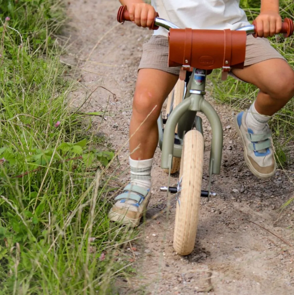Sød og nostalgisk taske i retrodesign, lavet i kunstlæder. Den har praktiske læderstropper, der gør, at den kan sættes fast på cykelstyret. Den passer perfekt til løbecyklerne fra Trybike. Tasken har plads til, at barnet kan få det “allervigtigste” med på tur. 18×9,5×5,5 cm.