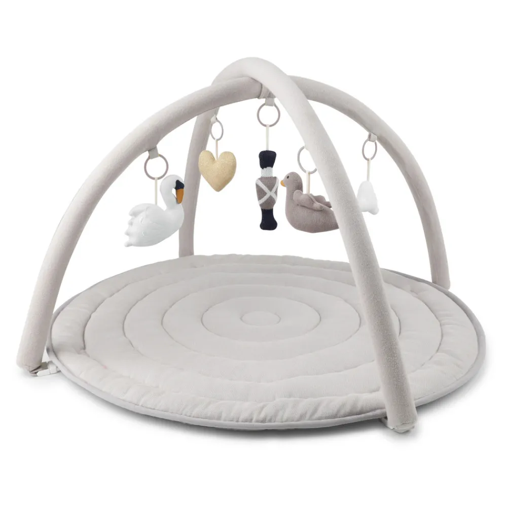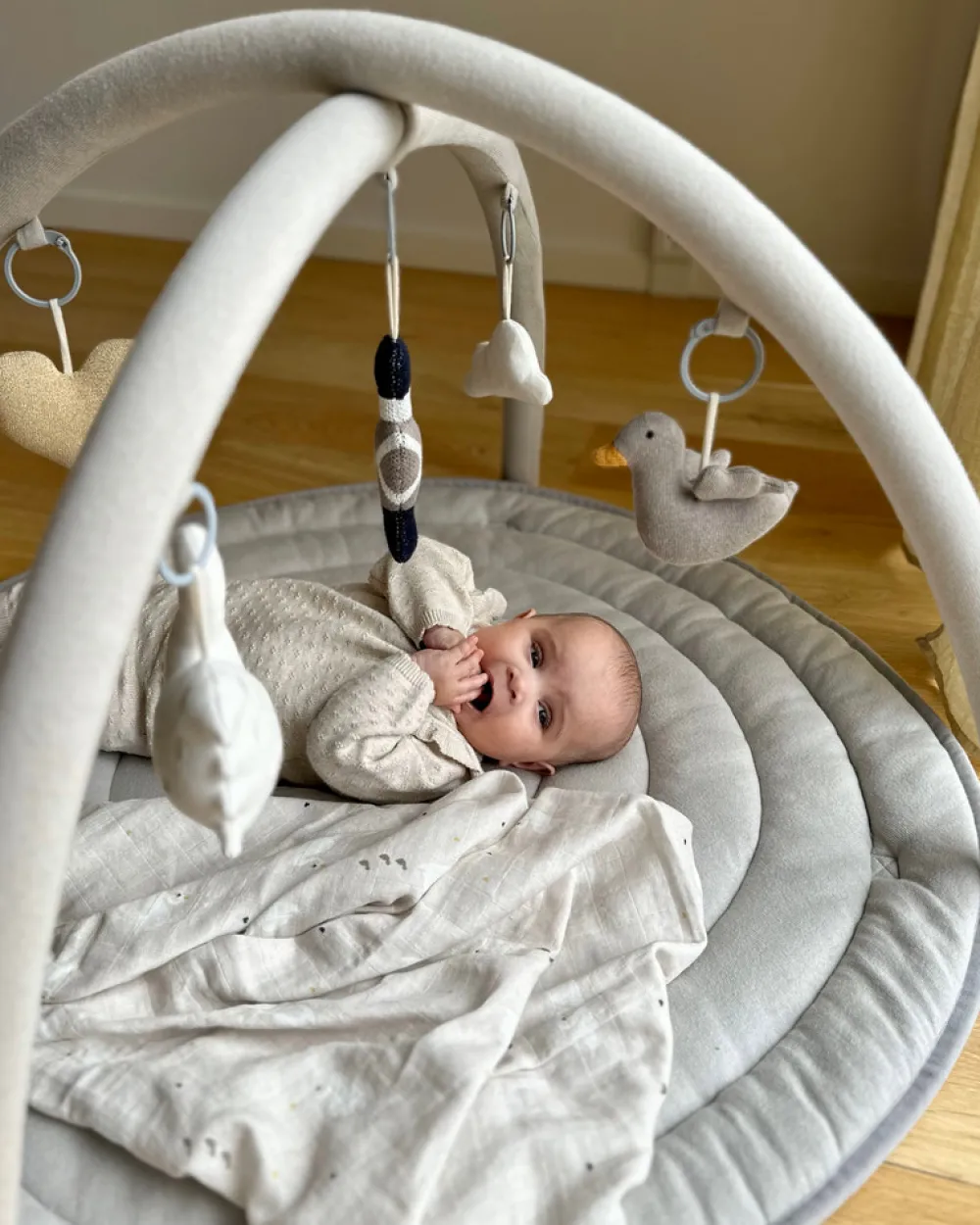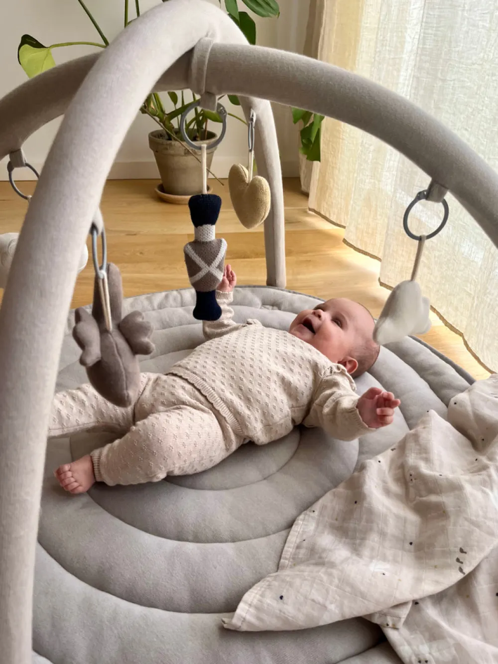 Aktivitetstæppet har blødt legetøj, der hænger i forskellige højder, dette kan være med til at opmuntre barnet til at udforske og gribe fat i legetøjet og være med til at udvikle dets motoriske færdigheder og hånd-øje-koordination.