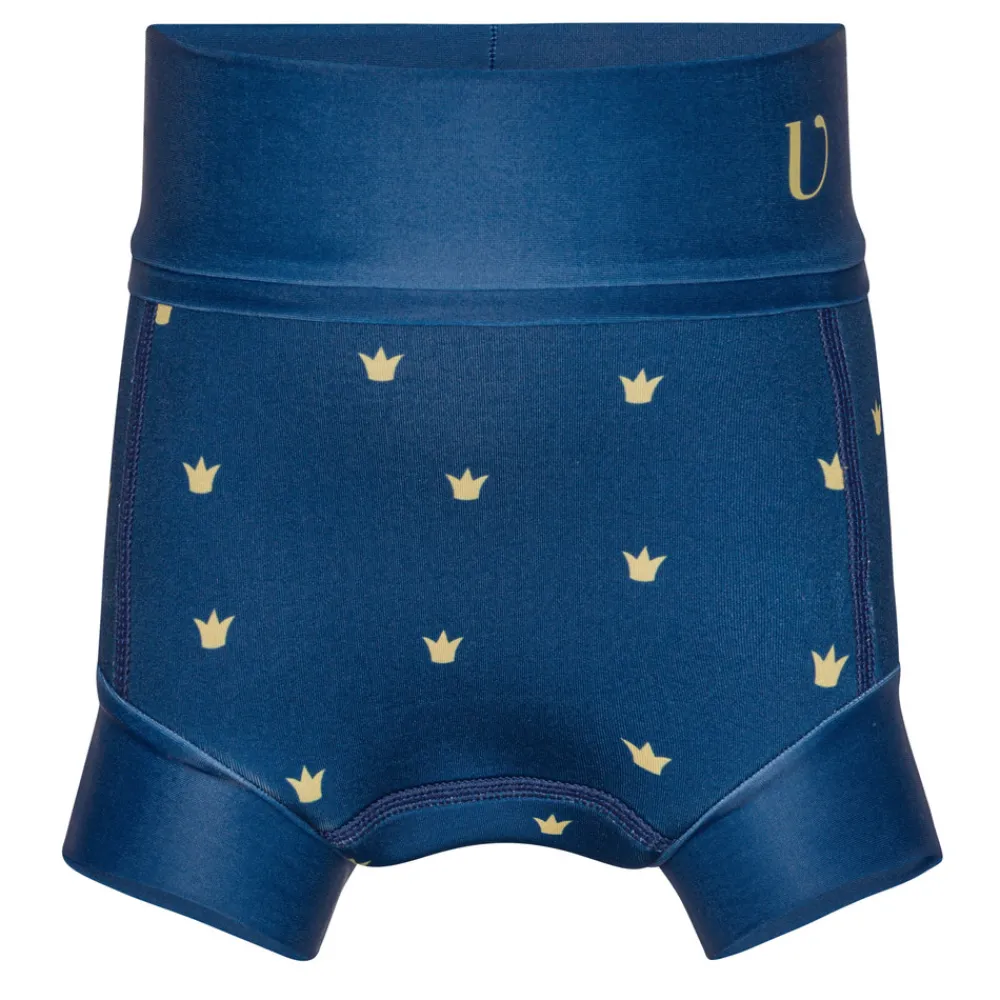 Ble- badebukserne er lavet i smidigt neopren og skal sidde til, for at være tætte nok og vil derfor synes lidt strammere end andre ble- badebukser. Rul linningen ned og før barnets ben igennem og rul derefter linningen op på plads. Med lidt øvelse er det super nemt.