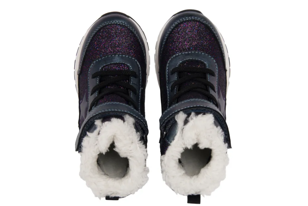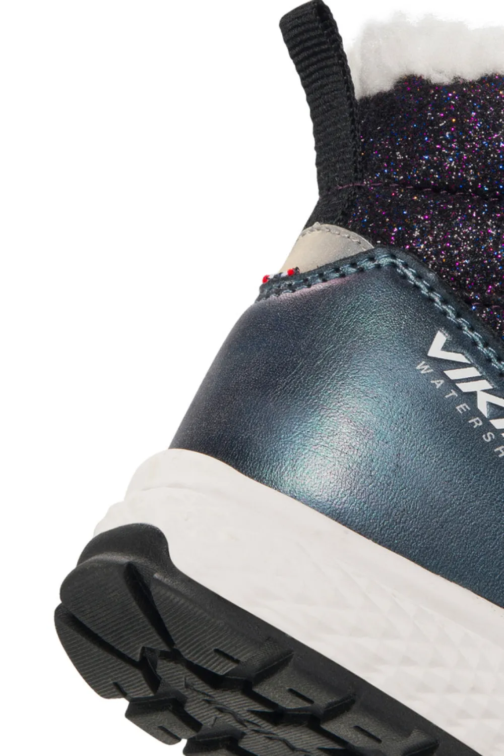 Gør dit barn klar til hverdagens eventyr med en støvle, der er både sjov og behagelig. Den robuste, iriserende overdel med glimmereffekt har elastiske snørebånd og én velcrolukning der sikrer en nem og personlig pasform. Vikings Watershield membran holder fugten ude, mens et varmt for holder kulden væk. En ydersål i gummi giver et solidt greb og plads til fodstropper gør støvlen perfekt til flyverdragten!
