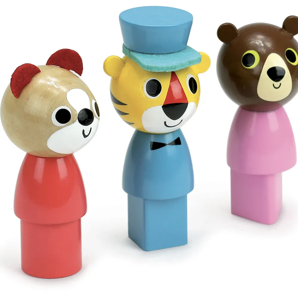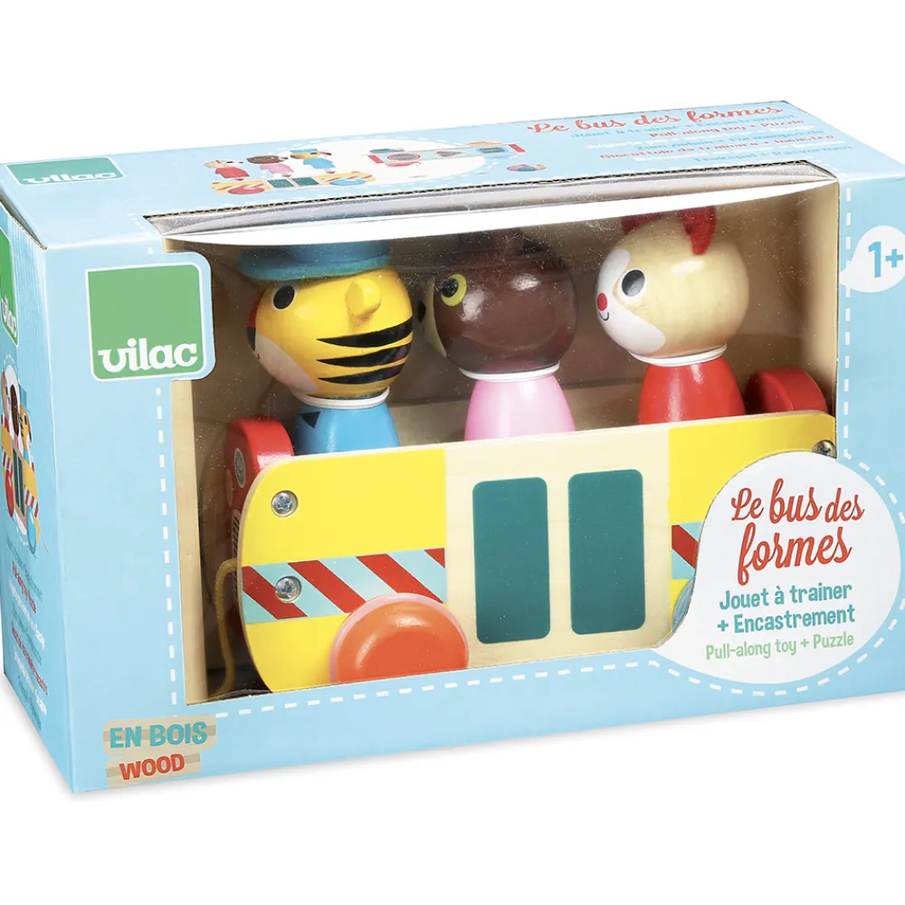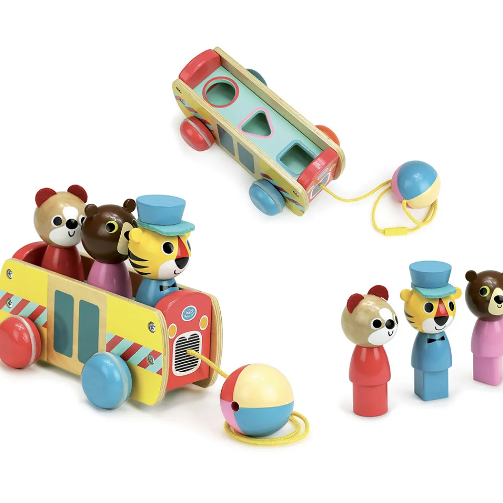 Træklegetøj formet som en bus med 3 passagerer. For enden af træksnoren sidder der en rund bold til at holde i, når bussen kører derudaf. Bussen og dens passagerer er fremstillet i træ.