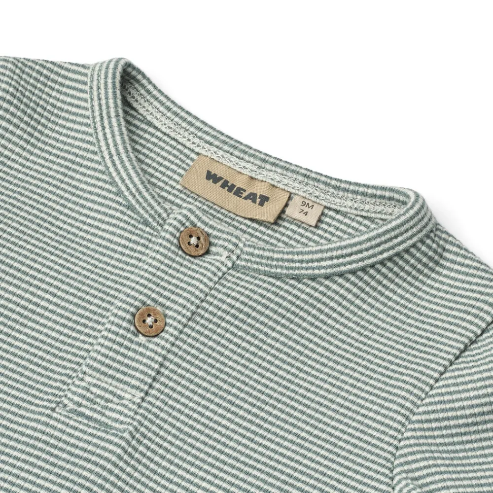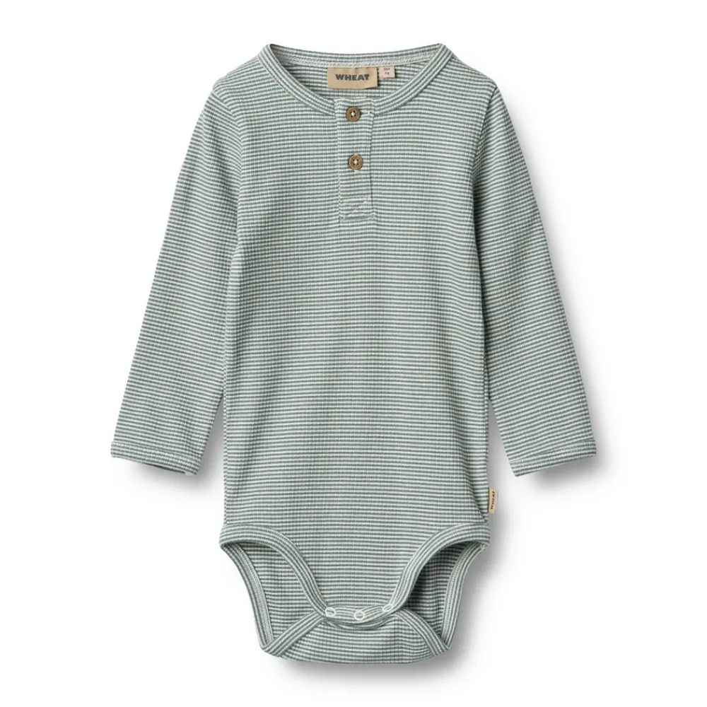 Wheat’s body er unisex og et sandt essentielt stykke tøj i din babys garderobe, da det kan bruges alene eller som et ekstra lag under hverdagsbeklædning. Bodyerne har enten trykknapper på skulderen eller knapper ved halsen for bedre komfort, når du klæder din baby på. Bodyen har også trykknapper i bunden, hvilket gør det lettere for dig at skifte din babys ble.