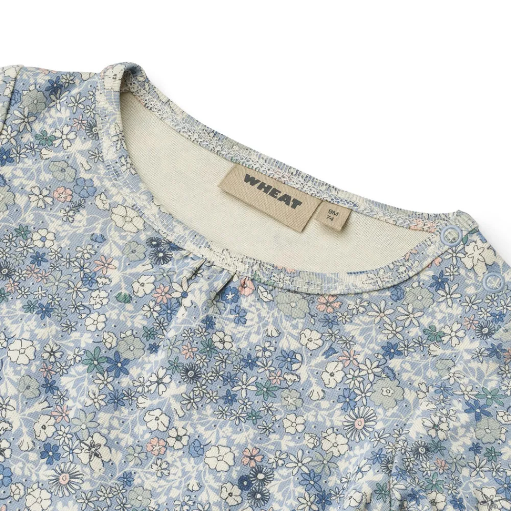 Wheats basis body er en sand klassiker i garderoben, når det kommer til småbørn. Denne body har trykknapper på den ene skulder samt i bunden for bedre komfort, når du skal klæde dit barn på. Brug bodyen som den inderste del i ethvert outfit, da den er blød at have tæt på huden. Man kan style bodyen afhængigt af vejr og årstid ved blandt andet at bruge den under en kjole, til et par matchende leggings eller på kølige dage med en sweater/strik udover.