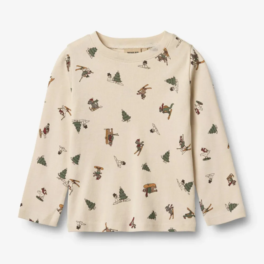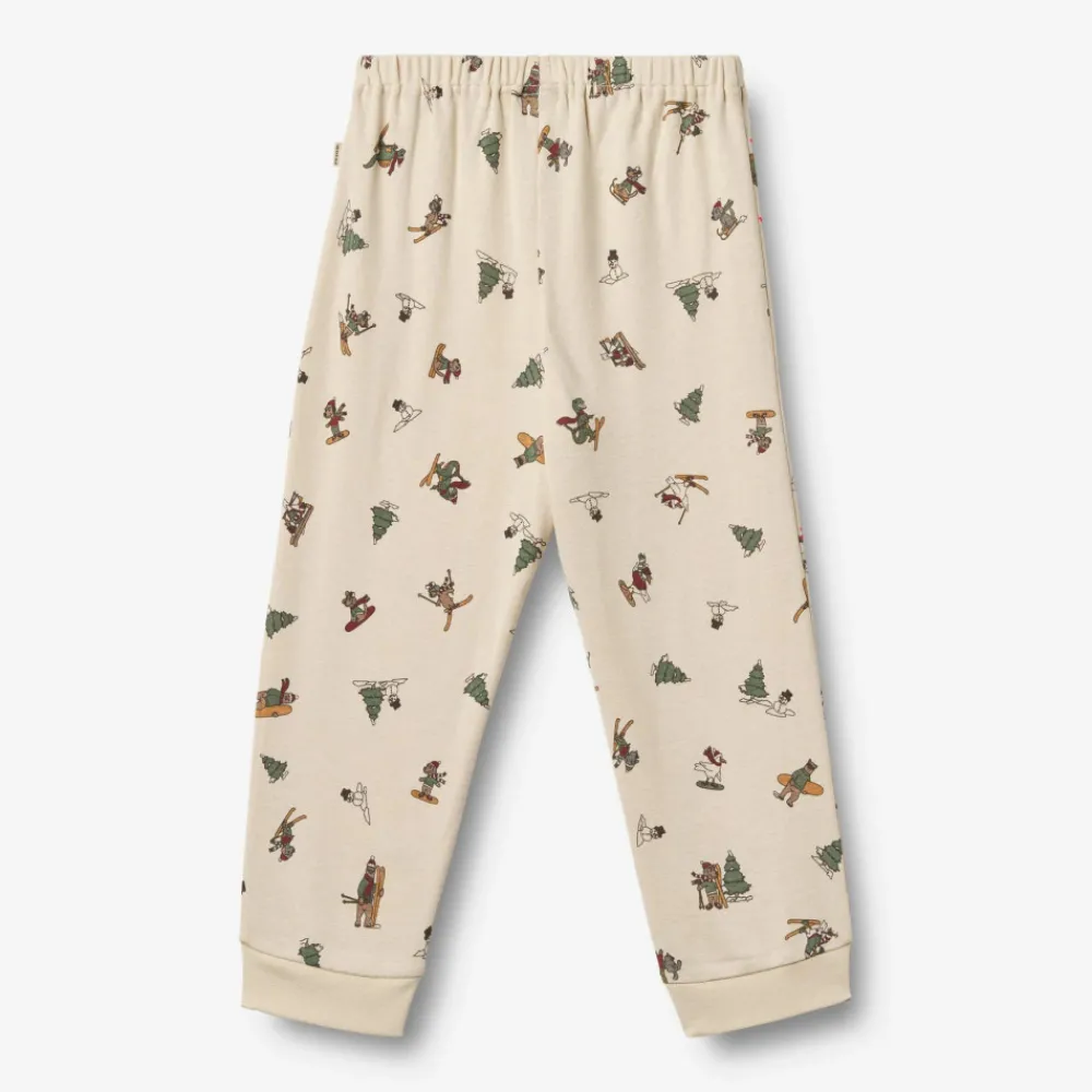 2-delt pyjamas med julemotiver i blødt økologisk bomuld til børn. Wheats charmerende pyjamas med julemotiver er skabt til at sprede magisk julestemning. Med sin bløde pasform er den både let og behagelig for dit barn at have på hele dagen.Det bløde nattøj er perfekt til de kolde efterårs- og vinternætter. Pyjamassættet kommer med matchende T-shirt og bukser. T-shirten er simpel og langærmet, hvor bukserne har en blød elastik i taljen.