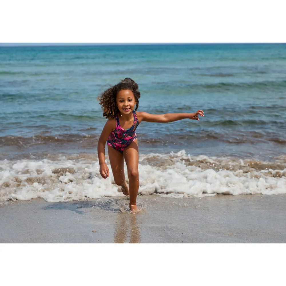 Lad din lille pige stråle som en flamingo i denne smukke badedragt. Med et livligt flamingo print og en komfortabel pasform, er denne badedragt perfekt til sommerens sjove dage ved poolen eller stranden. Den er lavet af blødt og holdbart materiale, der sikrer, at der kan leges og svømme uden bekymringer.