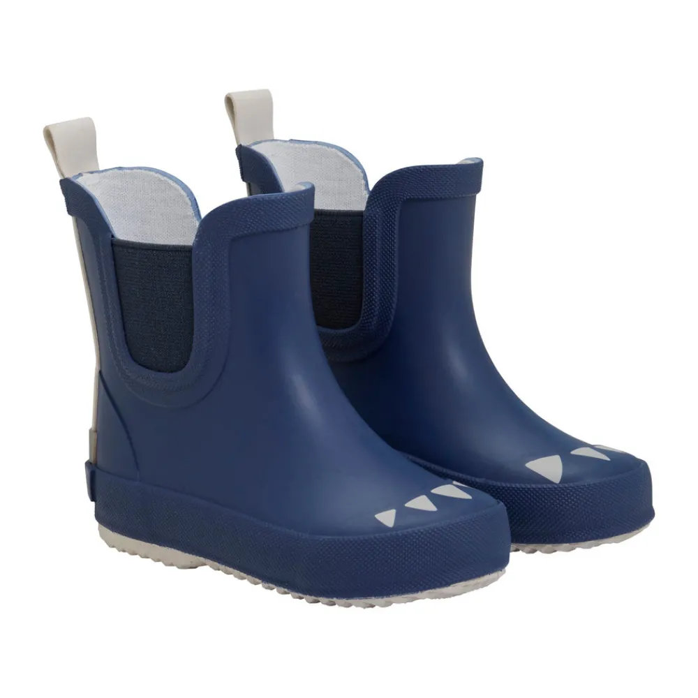 Korte gummistøvler med smart dino print fra CeLaVi. Gummistøvlerne er håndlavede i naturgummi og har en refleksstribe bagpå. Siden gummistøvler til børn ofte bliver brugt i flere timer af gangen, er det vigtigt for CeLaVi at de er både behagelige og funktionelle. Modellen er smallere ved hælen, så barnet bedre kan gå, løbe og lege.