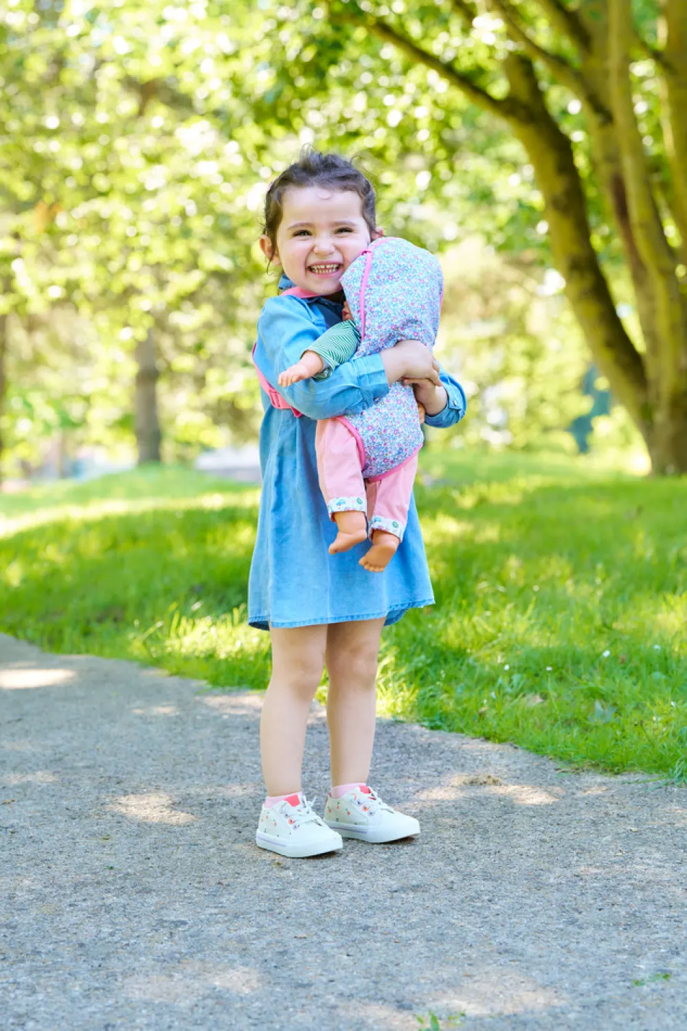 Denne bæresele er ideel til dukker med en størrelse på 30 cm og er meget praktisk til at få din lille babydukke til at sove komfortabelt og tage den med overalt. Bæreselen er designet til at være let og behagelig for både barnet og dukken, hvilket gør den perfekt til lange lege- og gåture.