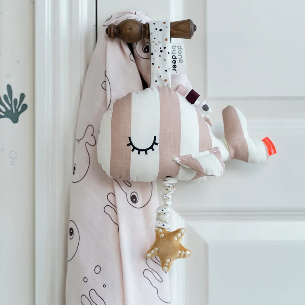 Lad søde Wally lulle de små i søvn eller lad den underholde ved puslebordet med den beroligende melodi ‘Over the rainbow’. Træk i den bløde søstjerne under Wallys mave, så vil den søde melodi afspilles. Det yndige musikalske legetøj er en dekorativ tilføjelse til børneværelset. Den praktiske velcro lukning gør det nemt at fastgøre den hvor som helst. Den søvnige hval med fine hvide og pudderfarvede striber har søde detaljer med kontrastfulde prikker og en blød søstjerne på maven. Den vil berolige de små, når det er tid til at slappe af eller tage på tur til drømmeland.