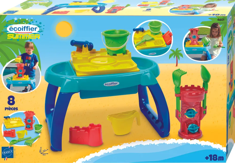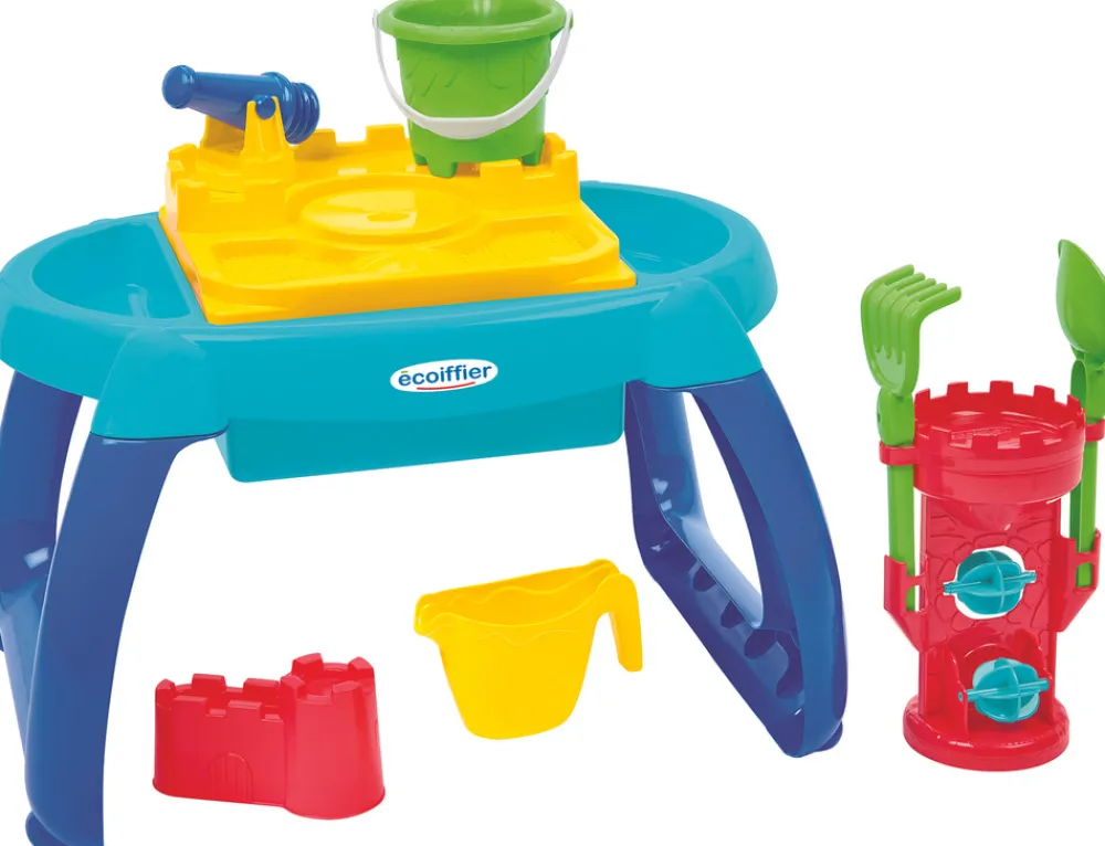 Bord med forskelligt tilbehør som kan bruges med sand og vand.