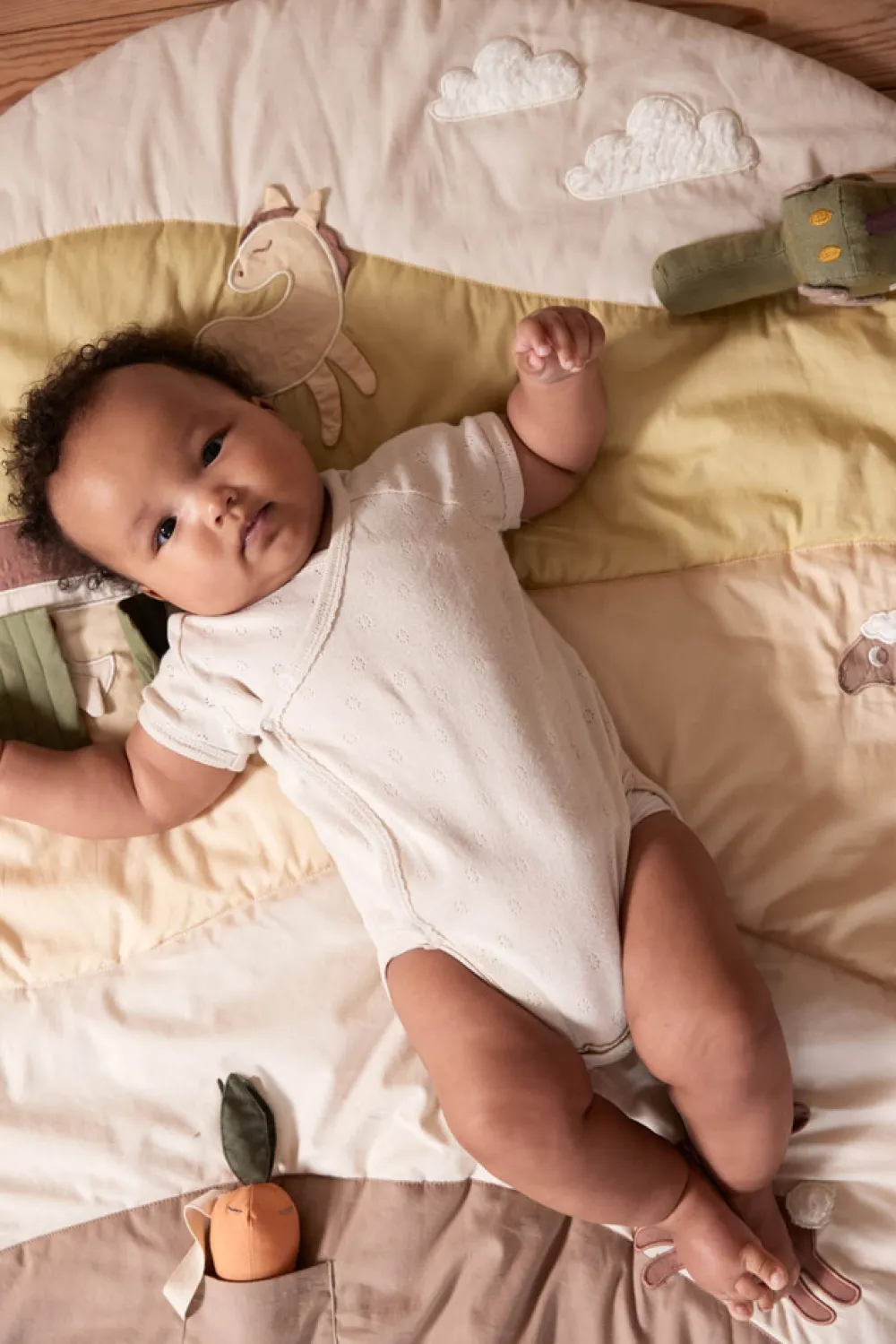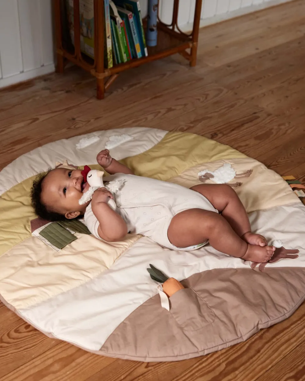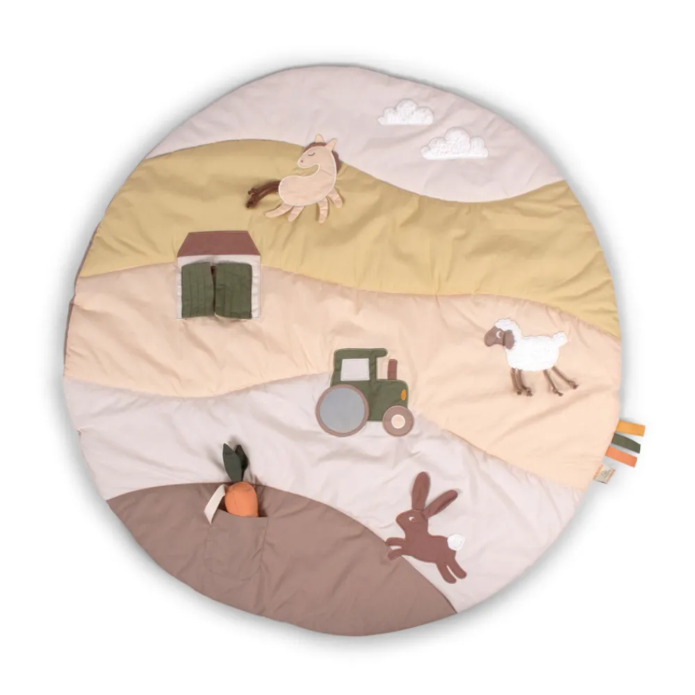 Sødt aktivitetstæppe med bondegårdstema, som har forskellige teksturer og funktioner til sensorisk leg og taktil stimulering. Den store bondegård byder på masser af sjove overraskelser – baby kan lege gemmeleg med kyllingen, grave en gulerod op eller se sig selv i traktorens spejl.