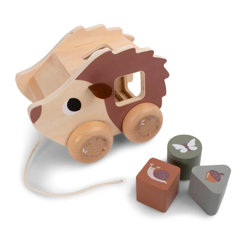 To af de mest elskede stykker babylegetøj; trække-dyret og puttekassen kombineret i én. Dette søde pindsvin vil elske at følge dig rundt i huset, og puttekassen vil helt sikkert holde dine små hænder beskæftiget i en rum tid.