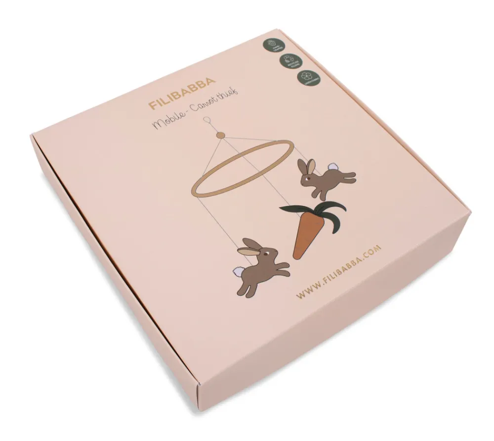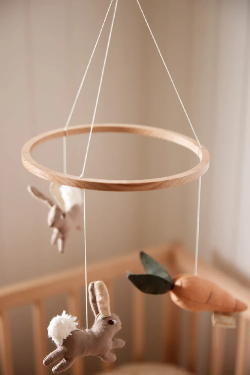 Den søde uro er lavet af hørstof og består af en bambusring med to frække kaniner og en lækker gulerod. Figurerne er håndlavede med mange fine detaljer, der vil bringe glæde til både børn og forældre.