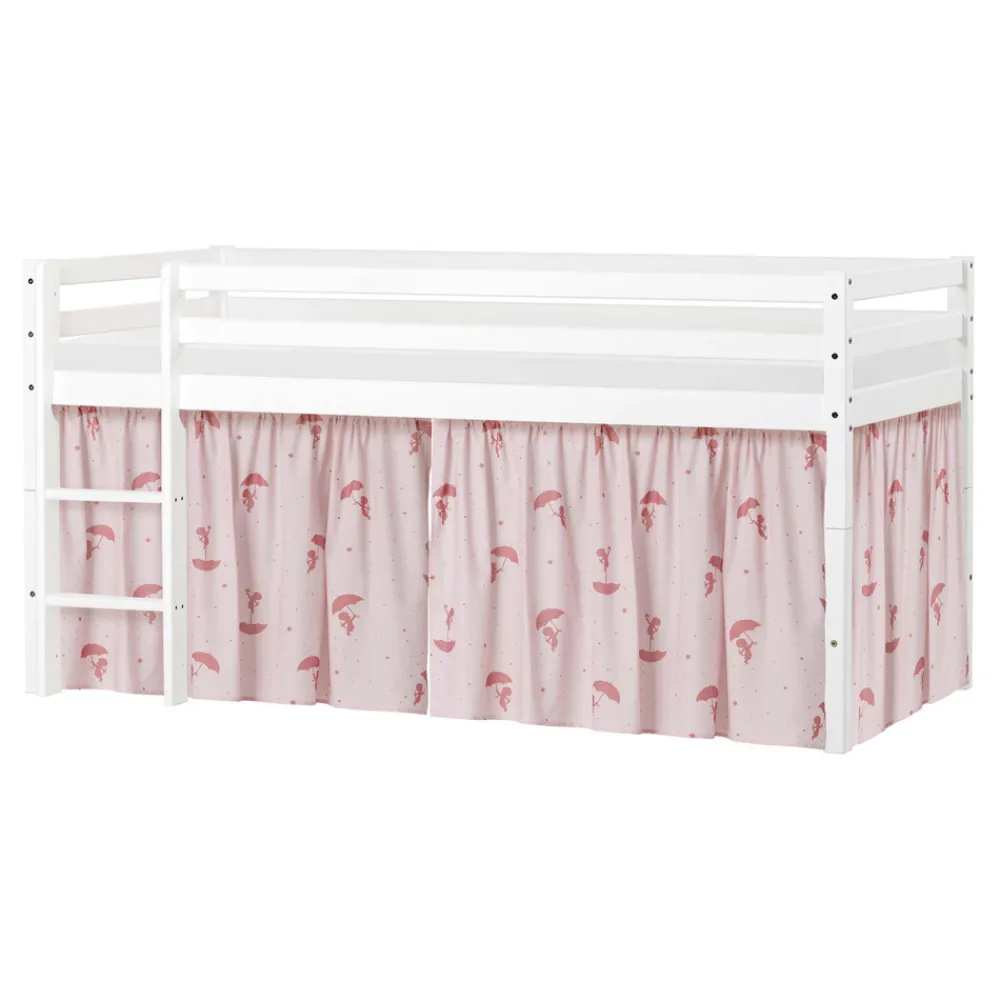 Med denne seng fra Hoppekids får man både ECO Dream juniorsengen og et modul så den kan bygges til en smart og sej halvhøj seng. Sengen giver mere gulvplads til leg og mulighed for at lave en hyggelig hule under sengen. Med en størrelse på hele 90×200 cm. bliver Hoppekids juniorsengen en god base til barnet for en god og tryg nattesøvn. Denne fine og enkle halvhøj juniorseng fra Hoppekids giver mange muligheder og er derfor mere end bare en seng. ECO Dream halvhøj seng er en smart seng til dem der virkelig ønsker at have lege eller opbevaringsplads under sengen. Hvis behovet opstår hvor der ikke er brug for en halvhøj seng, er det lige til og enkelt at lave den om til en juniorseng – sengen er nemlig delbar. Den store størrelse 90×200 cm giver masser af plads til at vokse på og barnet kan bruge sengen helt indtil de er klar til et teenageværelse. Størrelsen giver samtidig mulighed for at en forælder kan ligge i sengen, fx hvis der skal læses godnathistorie. Med mulighed for disse løsninger, betyder det at sengen vokser med barnets og dets behov. Det håndsyede forhæng fra Hoppekids skaber en magisk og eventyrlig verden lige midt i børneværelset. Når forhænget monteres på sengen, er det ikke længere en seng, men en hyggelig hule med det fineste print af Ole Lukøje, hvor det er fantasien, der bestemmer. Det søde univers fra Ole Lukoie inviterer dit barn på eventyr i en spændende verden fyldt med fantasifulde historier. Forhænget skaber også en hyggelig hule under den halvhøje seng, som er perfekt til leg eller når dit barn har brug for en lille pause fra resten af verden. Dekorér eventuelt hulen med en madras, tæpper, puder, lyskæder og andre hyggelige sager.
