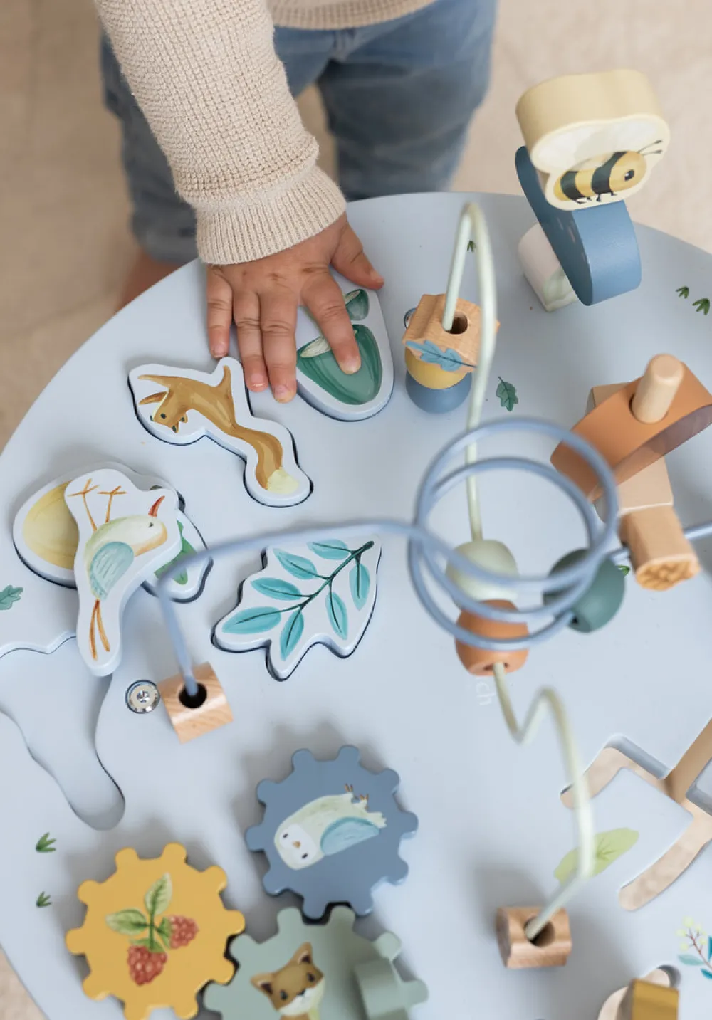 Stå op og leg! Opdag alle de aktiviteter dette bord har at byde på. Flyt perlerne fra den ene side til den anden på spiralstangen, byg et tårn, læg puslespillet eller drej på hjulene og flyt de små dyr fra Forest Garden kollektionen. Dette træaktivitetsbord udfordrer dit barn på mange måder. Der er 5 aktiviteter at udforske, hver især støtter udviklingen af finmotoriske færdigheder. Takket være det sikre og velafbalancerede design opmuntrer aktivitetsbordet også barnet til at stå op og bliver stående! Voksenmontering er påkrævet.
