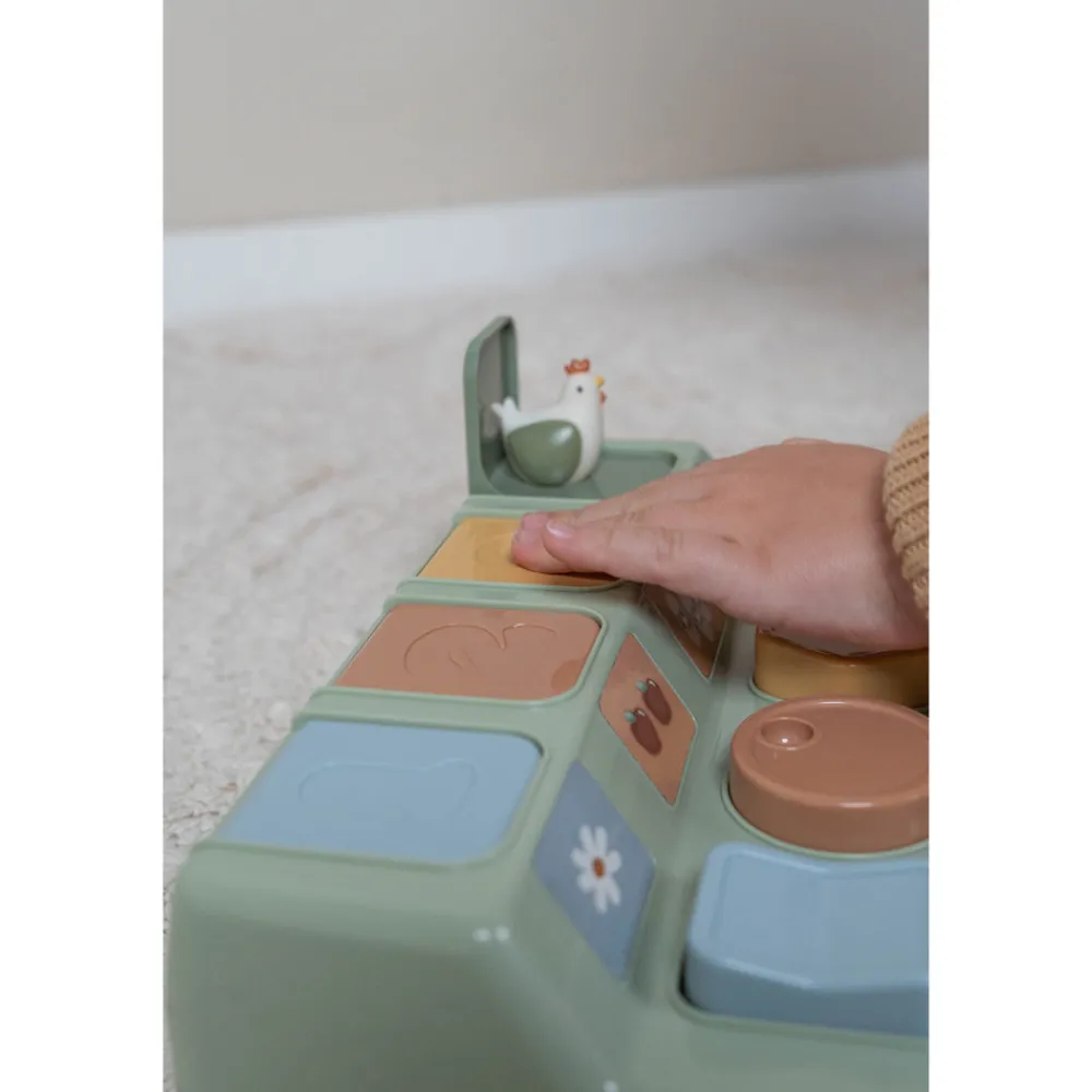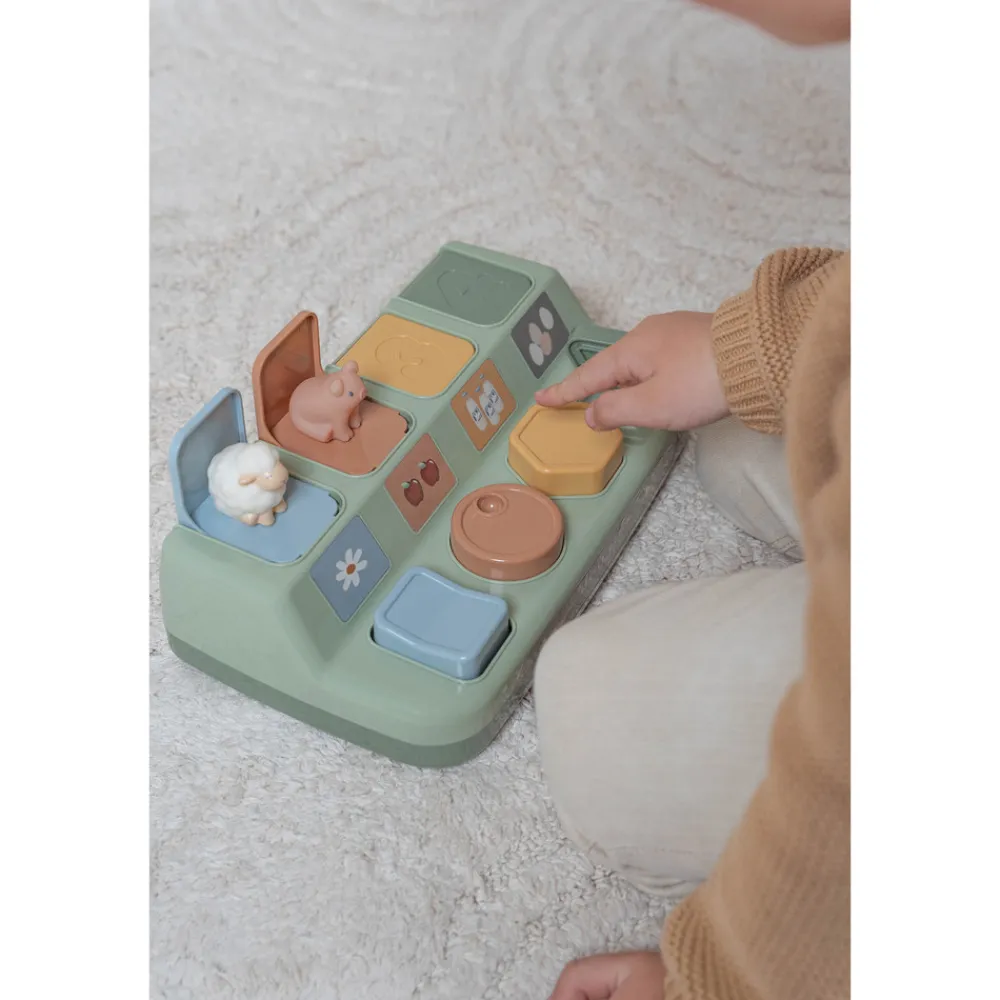Udfordre dit barns fantasi, kreativitet og motoriske færdigheder med dette Little Dutch Pop up Farm-spil. Træn legende farve- og formgenkendelse. Tryk eller drej på knapperne, og TADAA dukker et lille dyr fra Little Dutch Farm-serien op