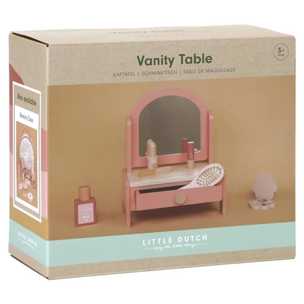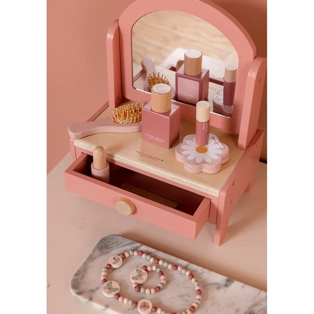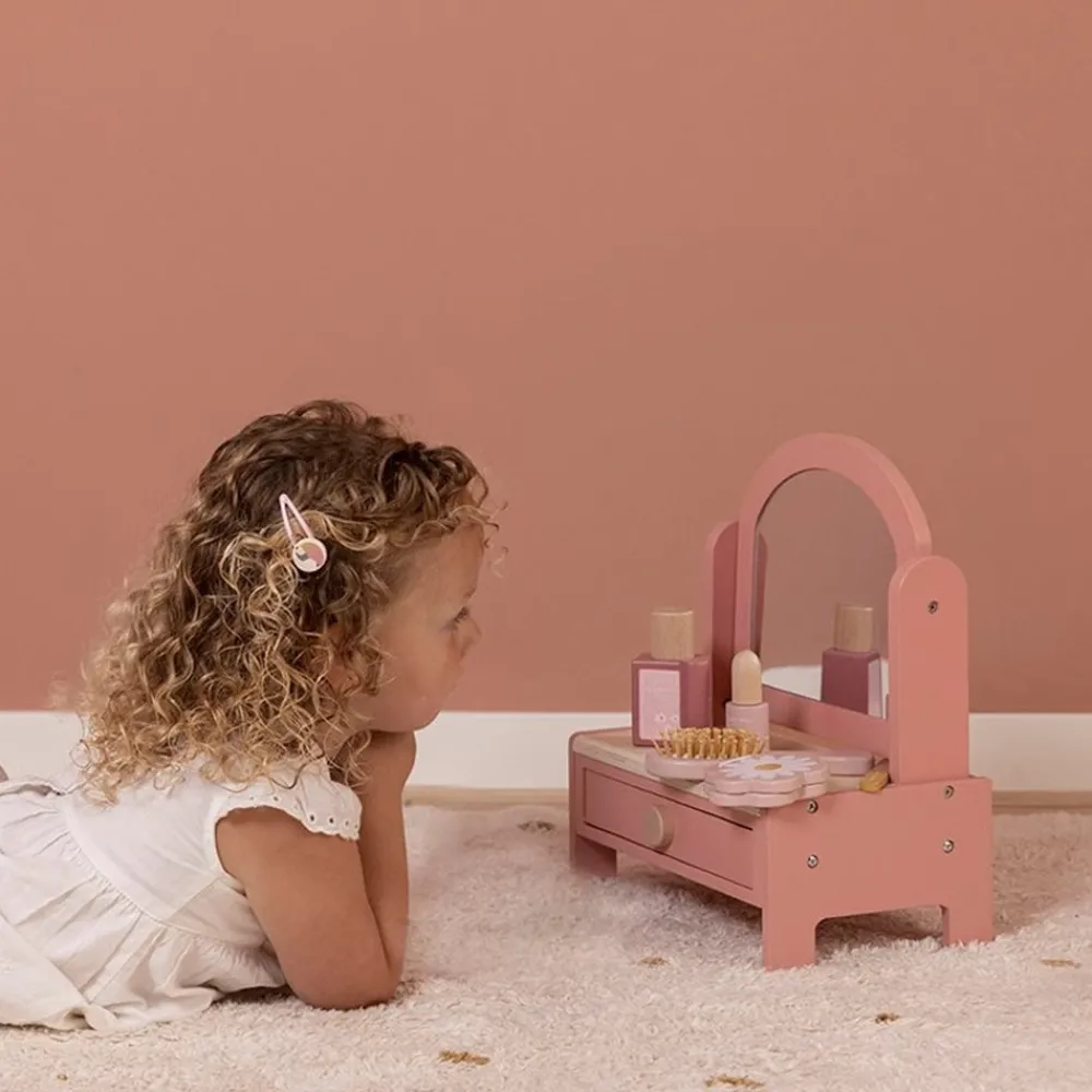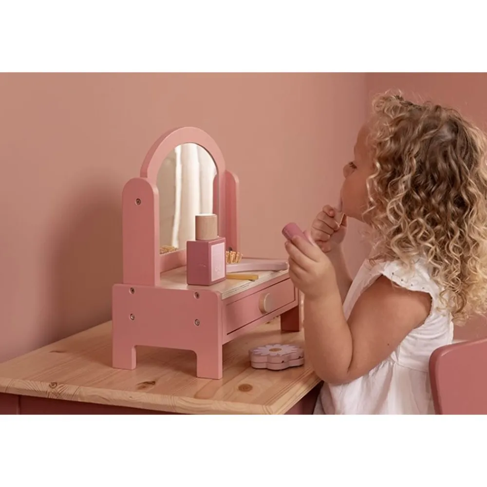 Lille spejl på væggen der! Dette fine sminkebord i træ til børn er designet til at fremme fantasifuld leg. Sminkebordet kommer med et roterende spejl og en række skønhedsprodukter, som foregiver leg, inklusive en hårbørste, parfume, læbestift, øjenskygge, neglefil og neglelak. Den har også en opbevaringsskuffe til at opbevare alt det fine hårpynt barnet måtte have derhjemme. Gengivet i en lyserød tone er den en fin tilføjelse til ethvert legerum. Designet til alderen 3 og opefter. Mål: 33×26,6×17,4 cm.