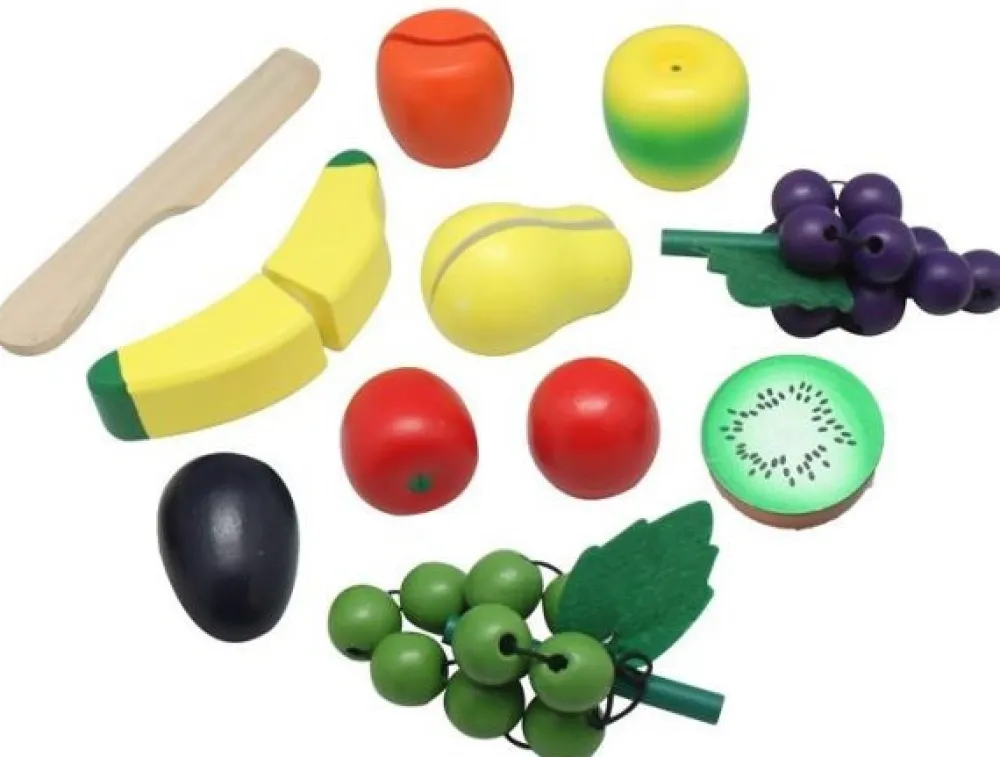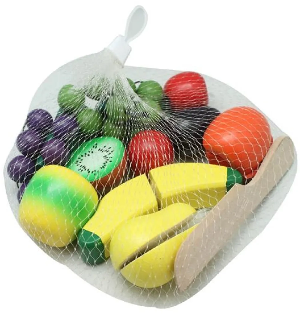 Eksotiske frugter i net. Nettet indeholder 12 dele inkl. kniv. De fleste af frugterne kan skæres over og samles igen med velcro, hvilket er super træning af finmotorikken. Frugterne er lavet i træ.