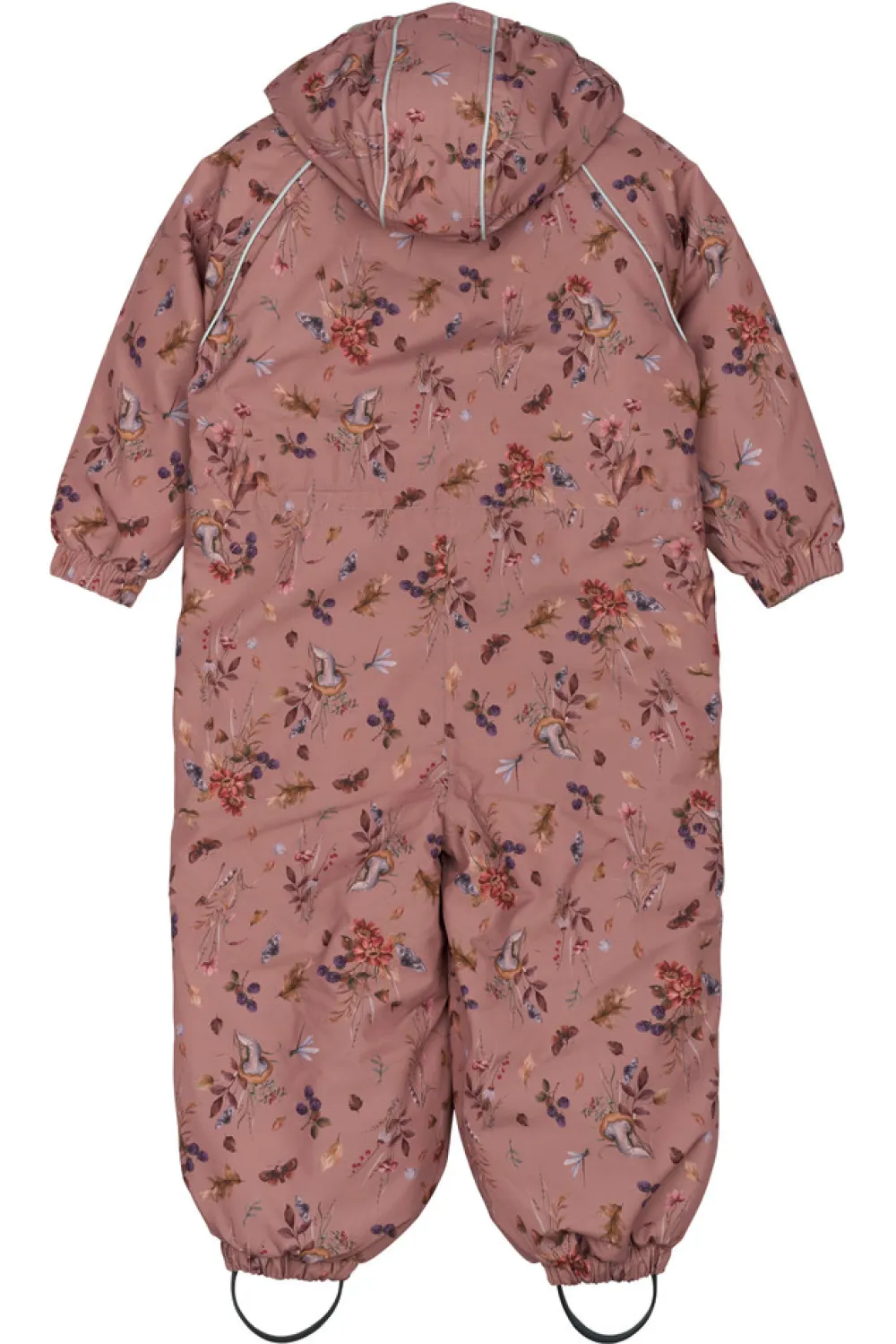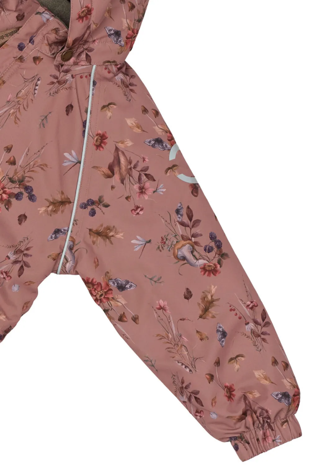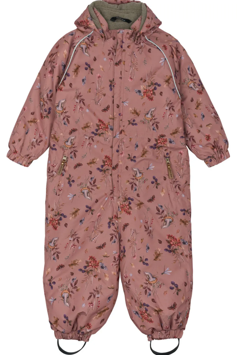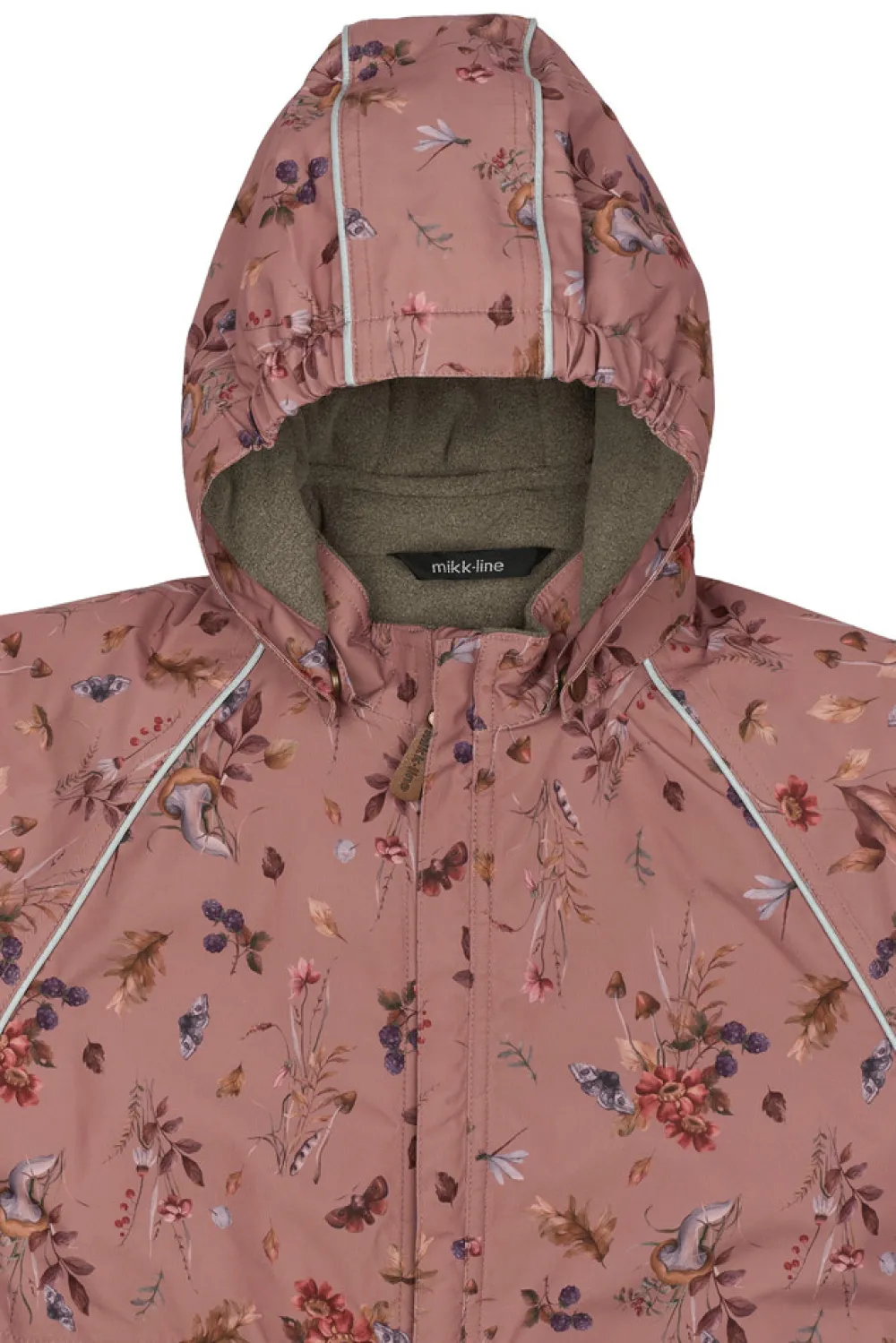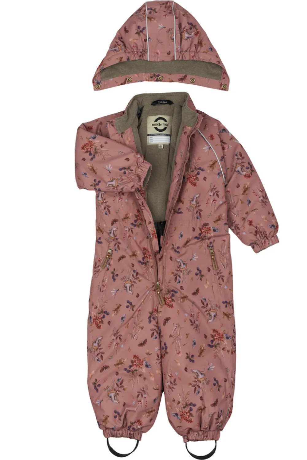Mikk-line flyverdragt med et fint blomstret print. I denne lækre flyverdragt kan barnet lege og udforske naturen under den åbne himmel i alt slags vejr i løbet af de kolde og våde efterår- og vintermåneder. Flyverdragten er lavet af genanvendt polyester og polstret med polyesterfyld. Hætten og overkroppen har blødt fleece foer, hvorimod ærmerne og benene har en glat og gnidningsfri indvendig overflade. Vi har anvendt Solution Dye til farvning af det glatte for, da det bl.a. mindsker forbruget af vand i produktionen. Den er naturligvis også fluorfri med BIONIC-FINISH® ECO imprægnering.