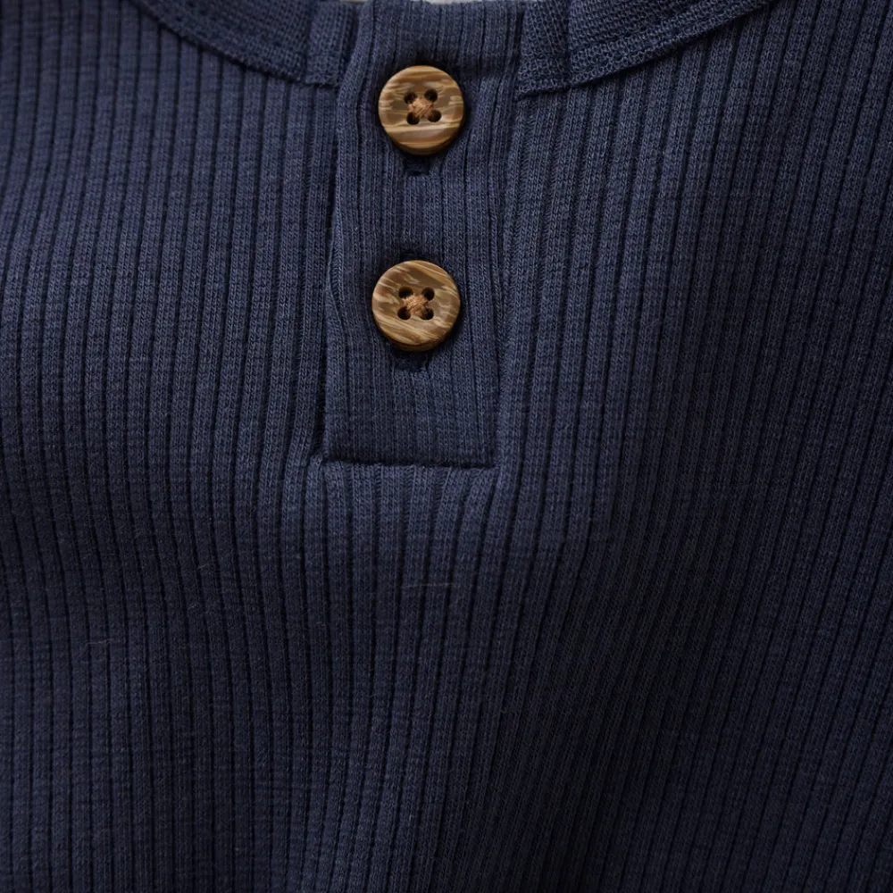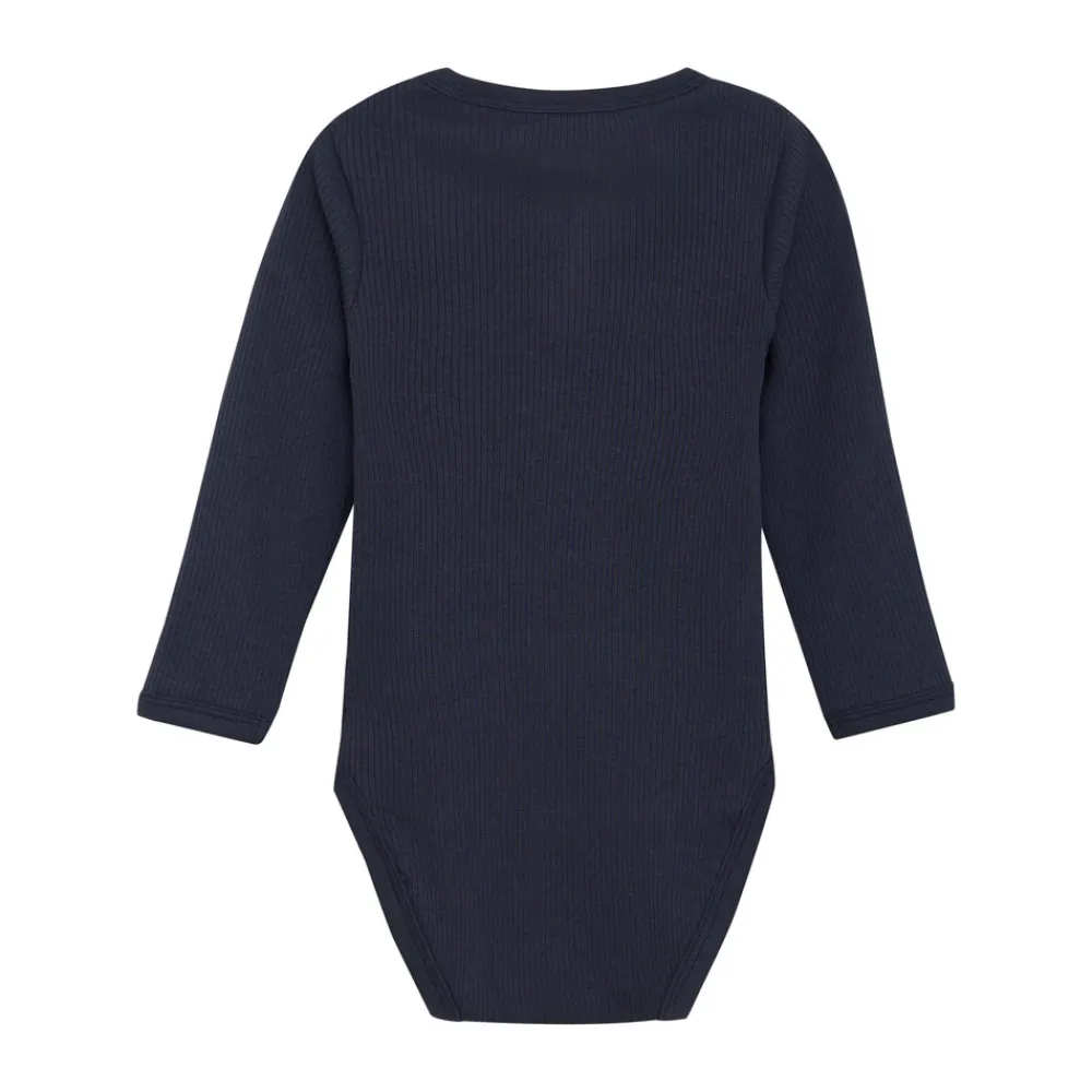 Sød ribstrikket body med lange ærmer fra Minymo. Bodyen er lavet i en blød og behagelig kvalitet, der føles skånsom mod barnets hud. Den har praktiske trykknapper mellem benene, som gør den nem at tage af og på.
