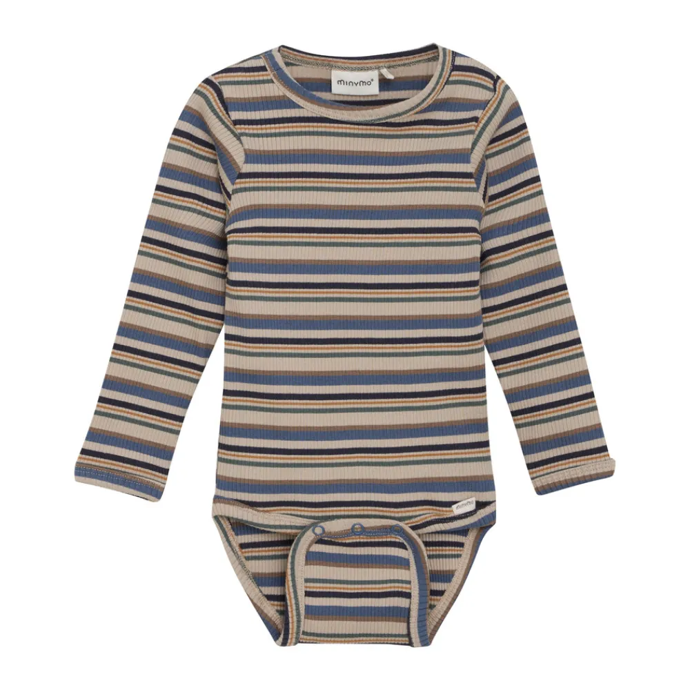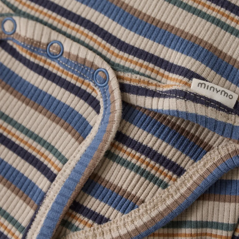 Langærmet body fra Minymo med stilfulde striber. Bodyen er lavet i en blød og behagelig bomuldsblanding, der føles skånsom mod barnets hud. Den praktiske lukning med trykknapper mellem benene gør det nemt at klæde barnet på og skifte ble. Et lille Minymo-logo ved benet giver et fint, diskret finish.