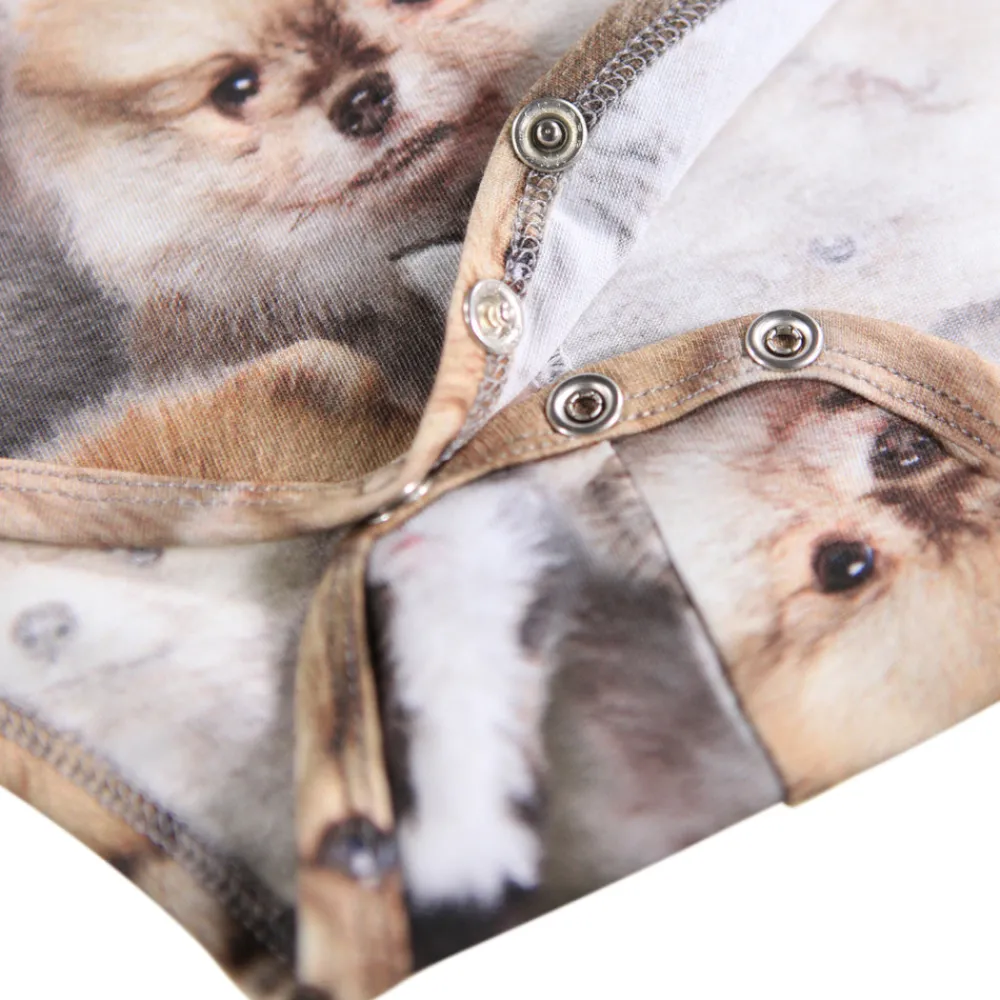 Bodystocking i blød økologisk bomuldsjersey med lange ærmer og fine flæsedetaljer omkring halsen. Den er afsluttet med kantbånd og har praktisk knaplukning i ryggen og mellem benene, som gør den nem at tage af og på.