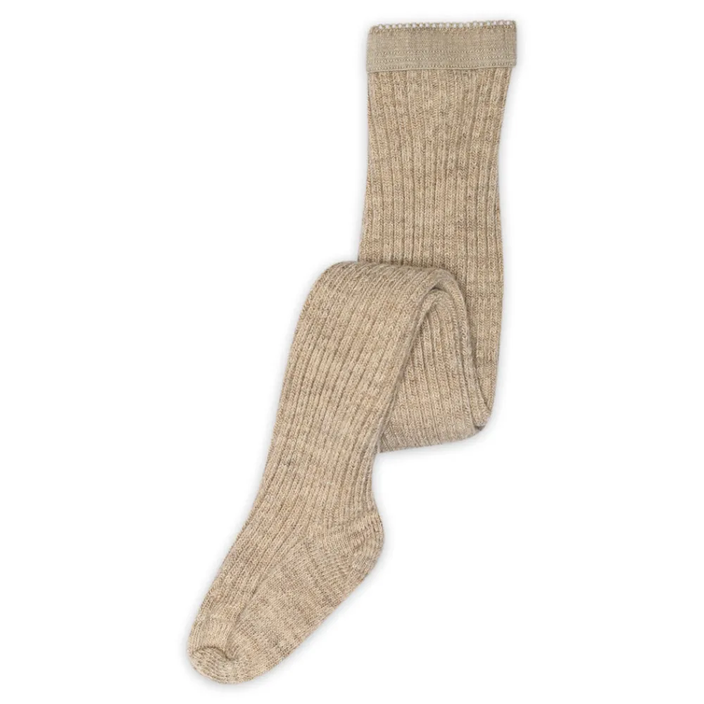Uldstrømpebukser med bred ribbet struktur fra mpKids. Strømpebukserne er strikket i en blanding af uld og bomuld, hvor bomuldsgarnet er på indersiden, hvilket gør strømpebukserne bløde mod barnets hud, samtidig med at de bevarer uldens egenskaber.