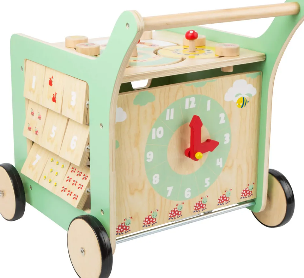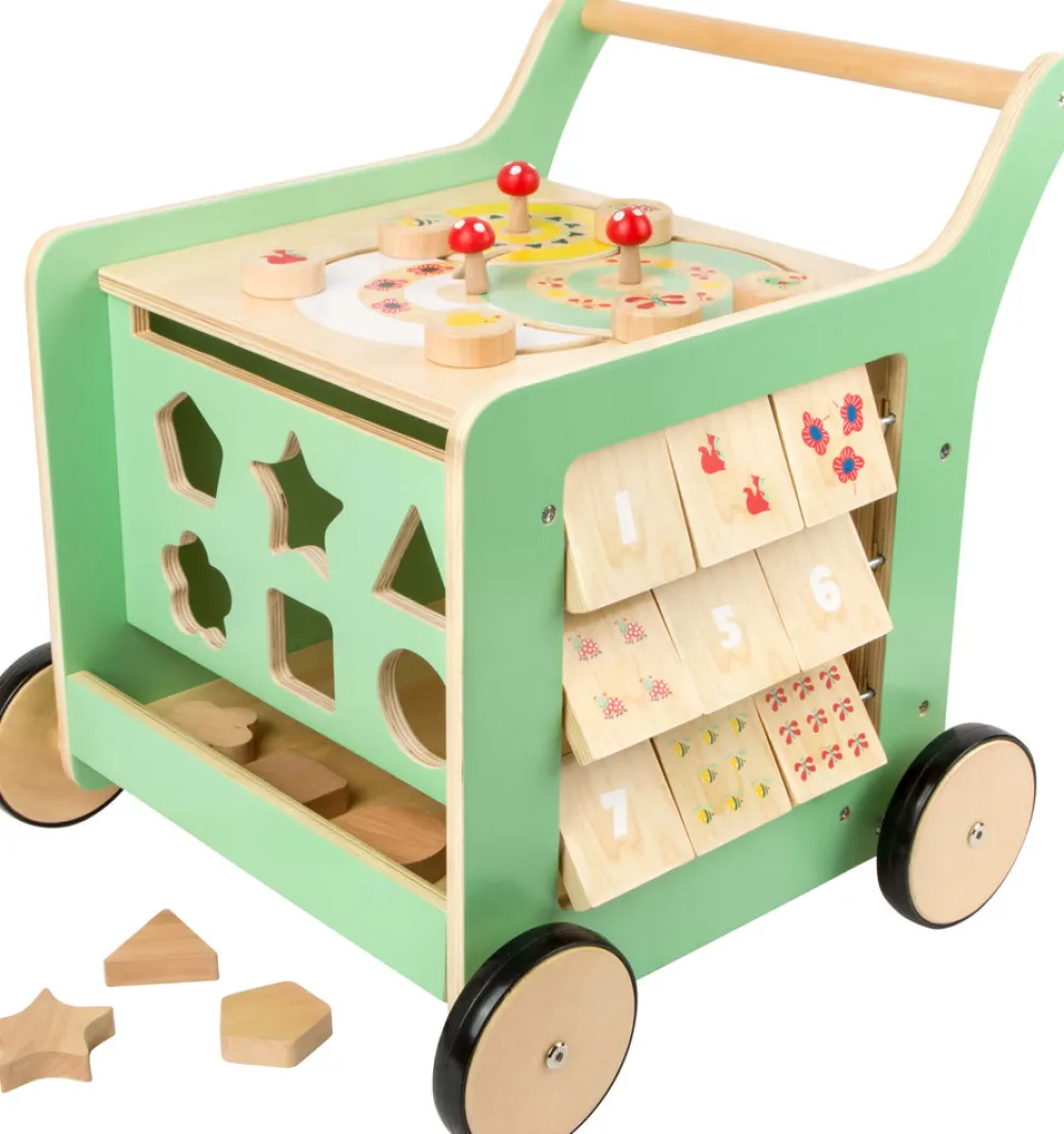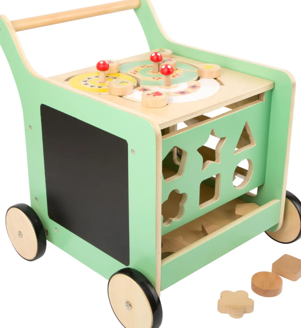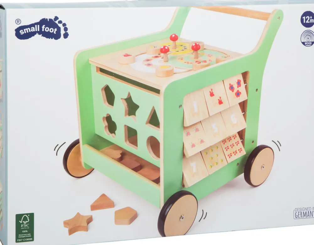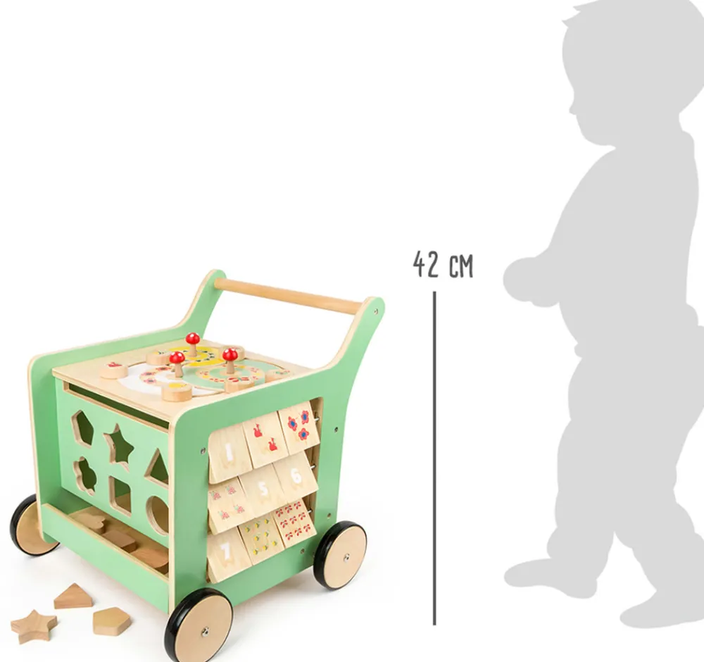 Denne gåvogn lavet af træ er en ægte allrounder med sine funktioner og sit minimalistiske design. Her kan du dreje, putte i og tegne. Toppladen kan hæves op og byder på masser af opbevaringsplads indeni til andet legetøj. Takket være bremsesystemet kan intet gå galt, mens du lærer at gå.