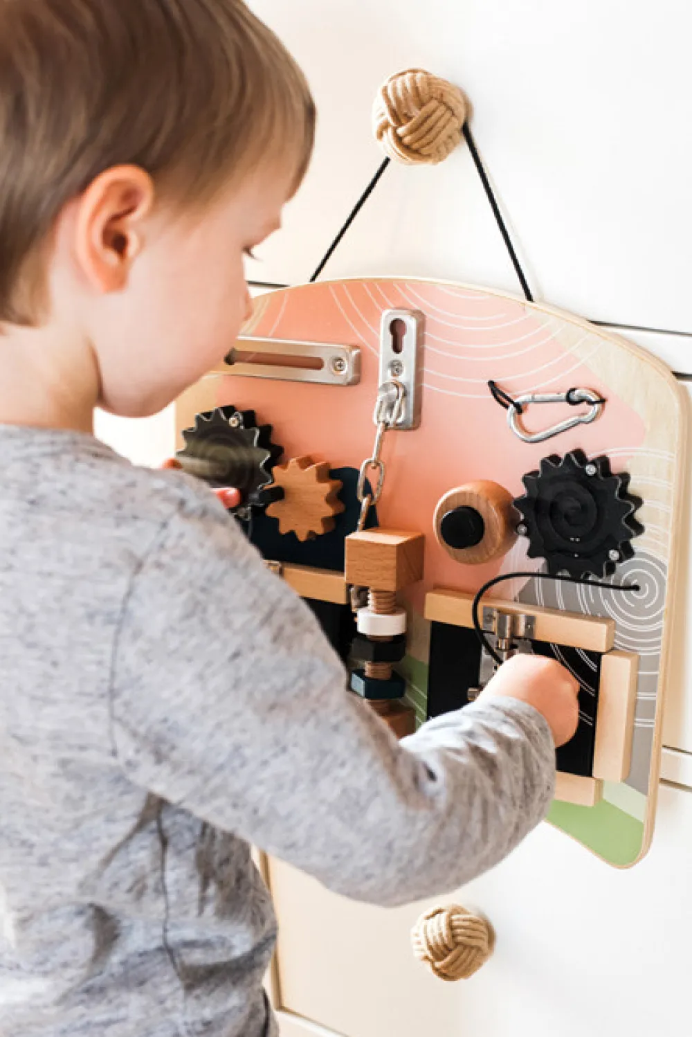 Dette læringsbræt i træ tilbyder 14 forskellige former for motorisk aktivitetssjov med forskellige slags låse og drejespil. Brættet i moderne, trendy farver og masser af synligt træmateriale præsenterer en bred vifte af mulige aktiviteter for at fremme udviklingen af finmotorikken. Fra en fjederkrog med løkke og en dørkæde, en hængelås, en rigellås og en stanglås til en cylinderlås med en nøgle, tilbyder dette aktivitetsbræt tonsvis af låse, som børn kender fra hverdagen og kan øve sig på en sjov måde. Yderligere funktioner som et gearspil med minilabyrint eller en gevindstang med roterende lodrette elementer og et knirkehorn afrunder dette aktivitetsbræt. Når børn åbner, lukker og drejer, træner de legende deres gribefærdigheder og hånd-øje-koordination. Dette legetøj er inspireret af Montessori-undervisningsmetoden, der udvikler motorikken optimalt. Dens ergonomiske form med en fordybning giver mulighed for behagelig leg foran barnet eller på skødet. Inkl. praktisk greb til at bære eller hænge op. Stangen og nøglen er bundet til et elastikbånd, så de ikke bliver væk.