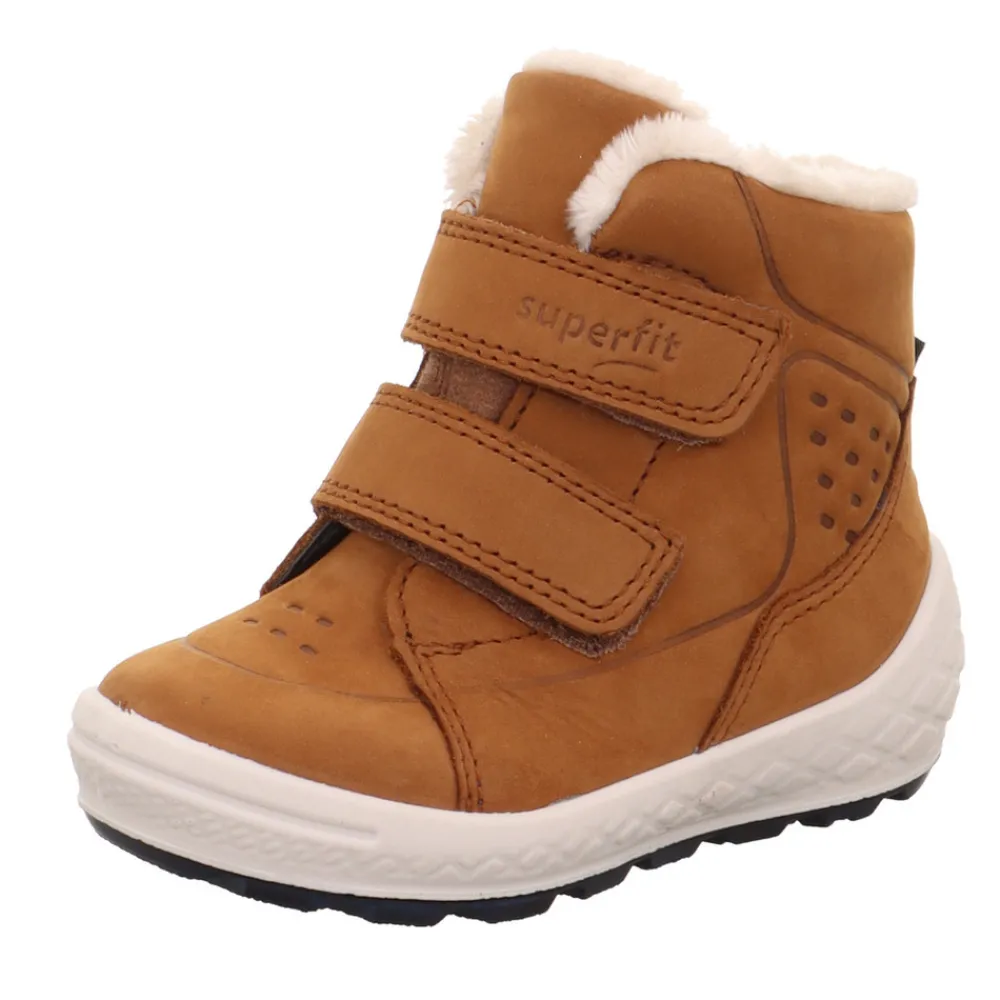 Med sit afslappede look og fremragende funktioner har GROOVY vinterstøvlen vist sig at være et hit hos de yngste børn. Superfit støvlens lækre design med dens hyggelige pelskrave og de elegante syninger får den til at se ud som om den er syet i hånden. Den lille støvle er lavet af et vidunderligt lunt ruskind, der er ekstremt behageligt for små fødder. Den innovative GORE-TEX-membran og den hyggelige, bløde lammeskindsforing garanterer at holde fødderne så varme som toast, uanset hvor koldt det er udenfor. Takket være de 2 velcrolukninger fungerer det som en charme at tage på og af. Plus, GROOVY kan tilpasses optimalt til enhver fod. Den tykke sål er smidig og understøtter fodens naturlige rulning. Det betyder maksimal gå komfort. Og det tofarvede design garanterer, at små trendsættere altid vil skære en streg.